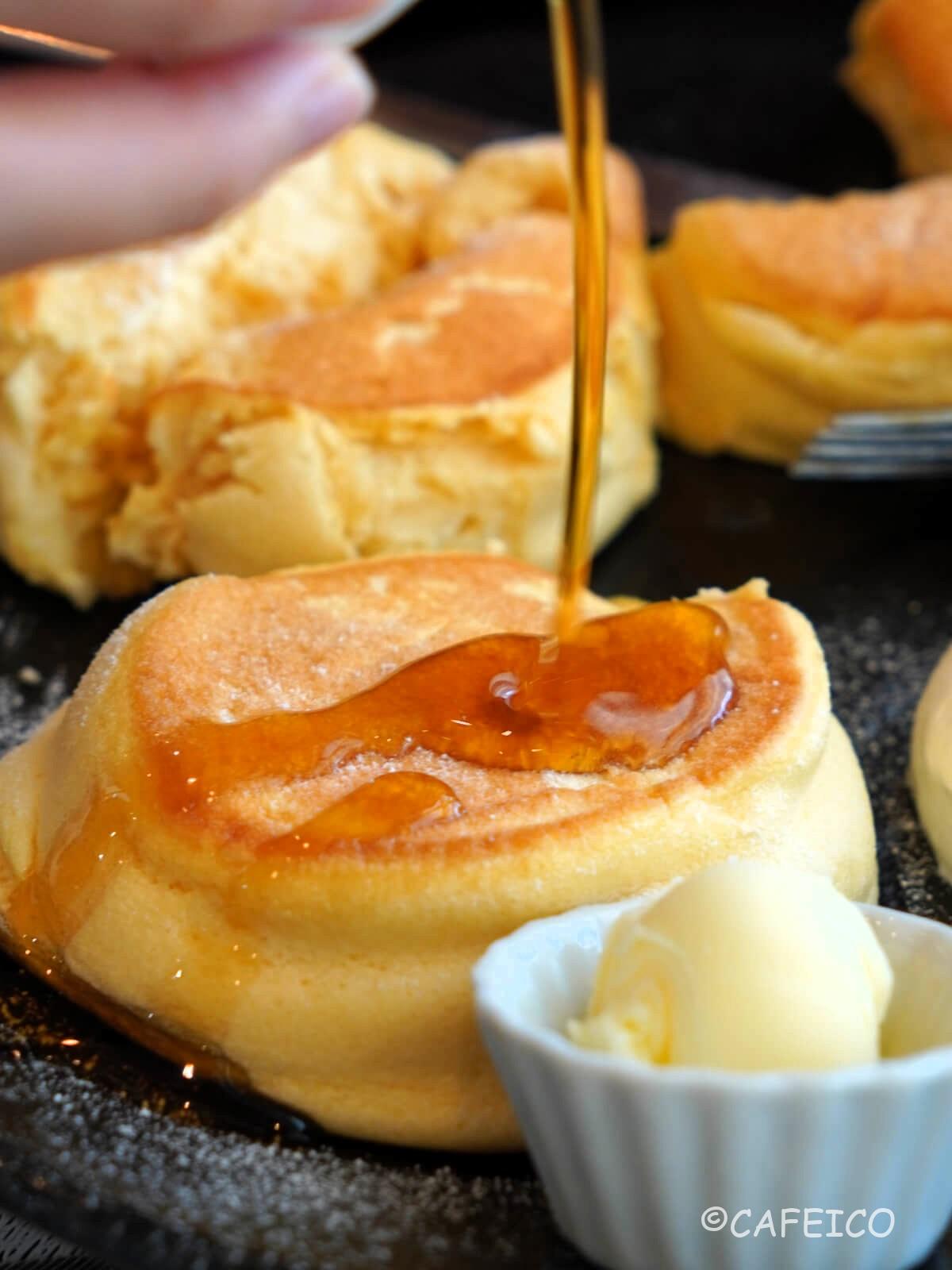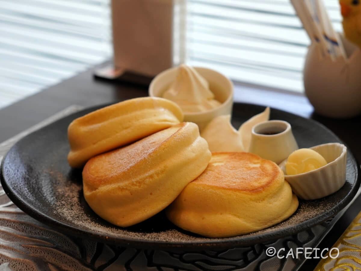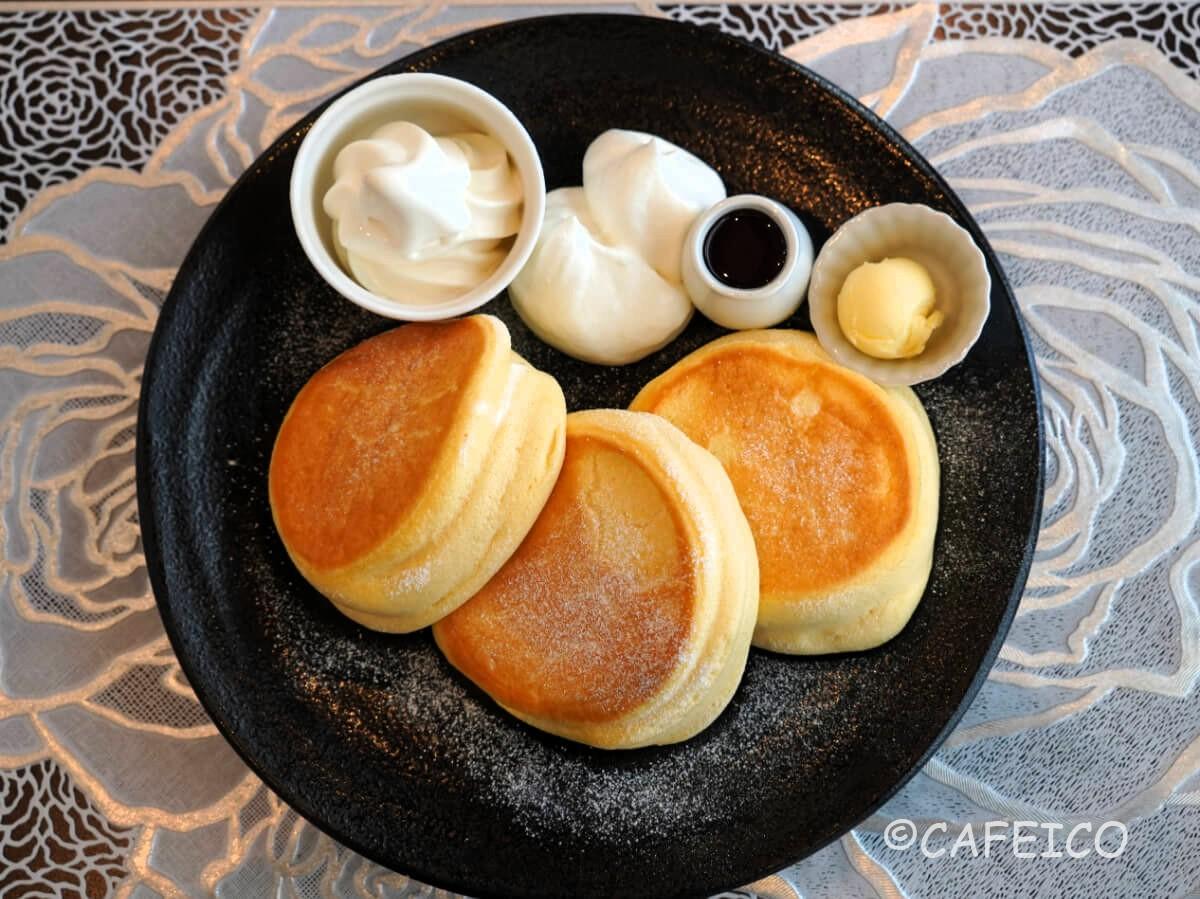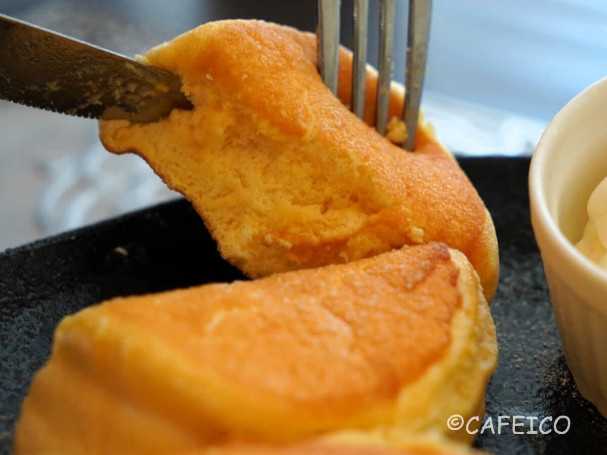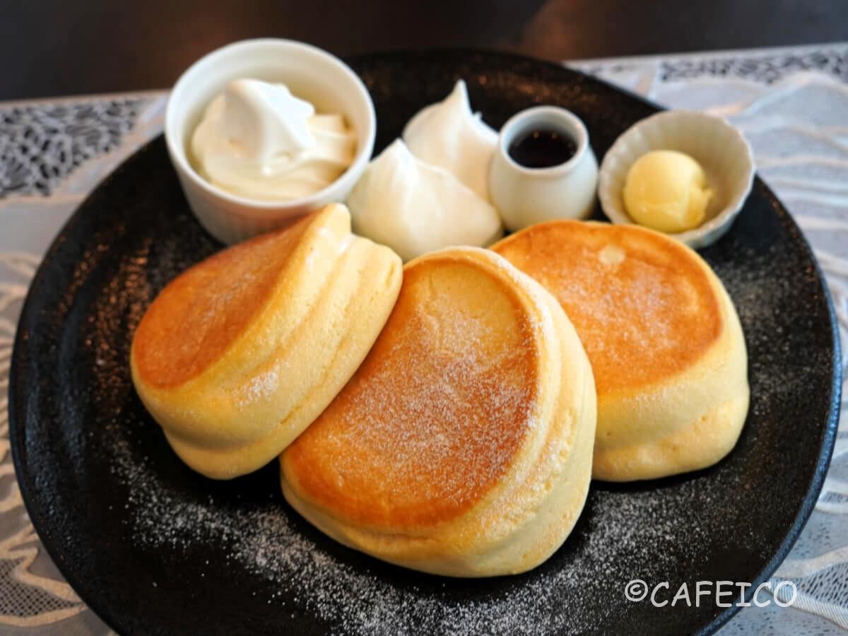 まずはプレーンのパンケーキ「モアスフレ(税込1,280円)」をいただきました。2枚と3枚を選ぶことができます。