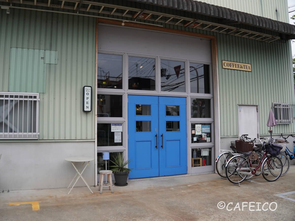 倉庫街に位置した青い扉が目印にカフェ。