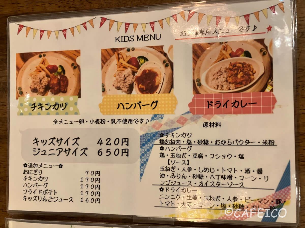 小麦粉・卵不使用のキッズメニュー。キッズサイズとジュニアサイズから選ぶことができます。