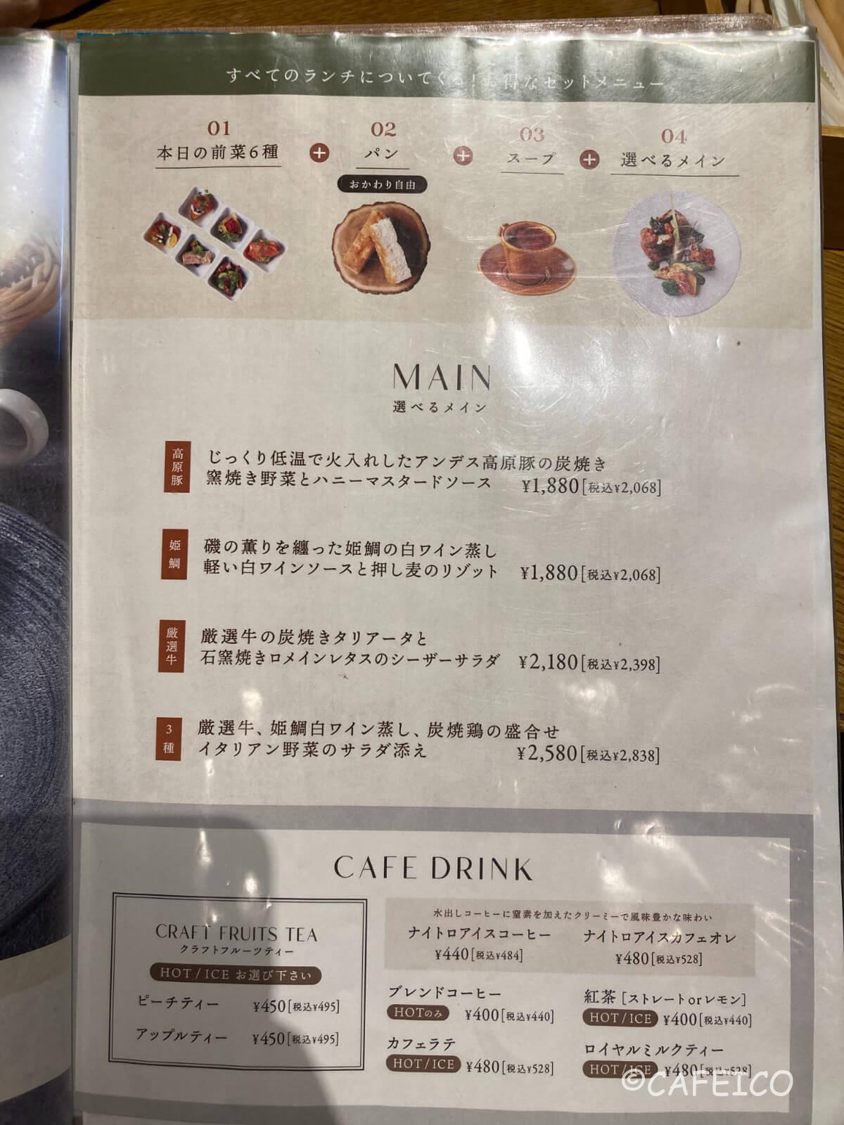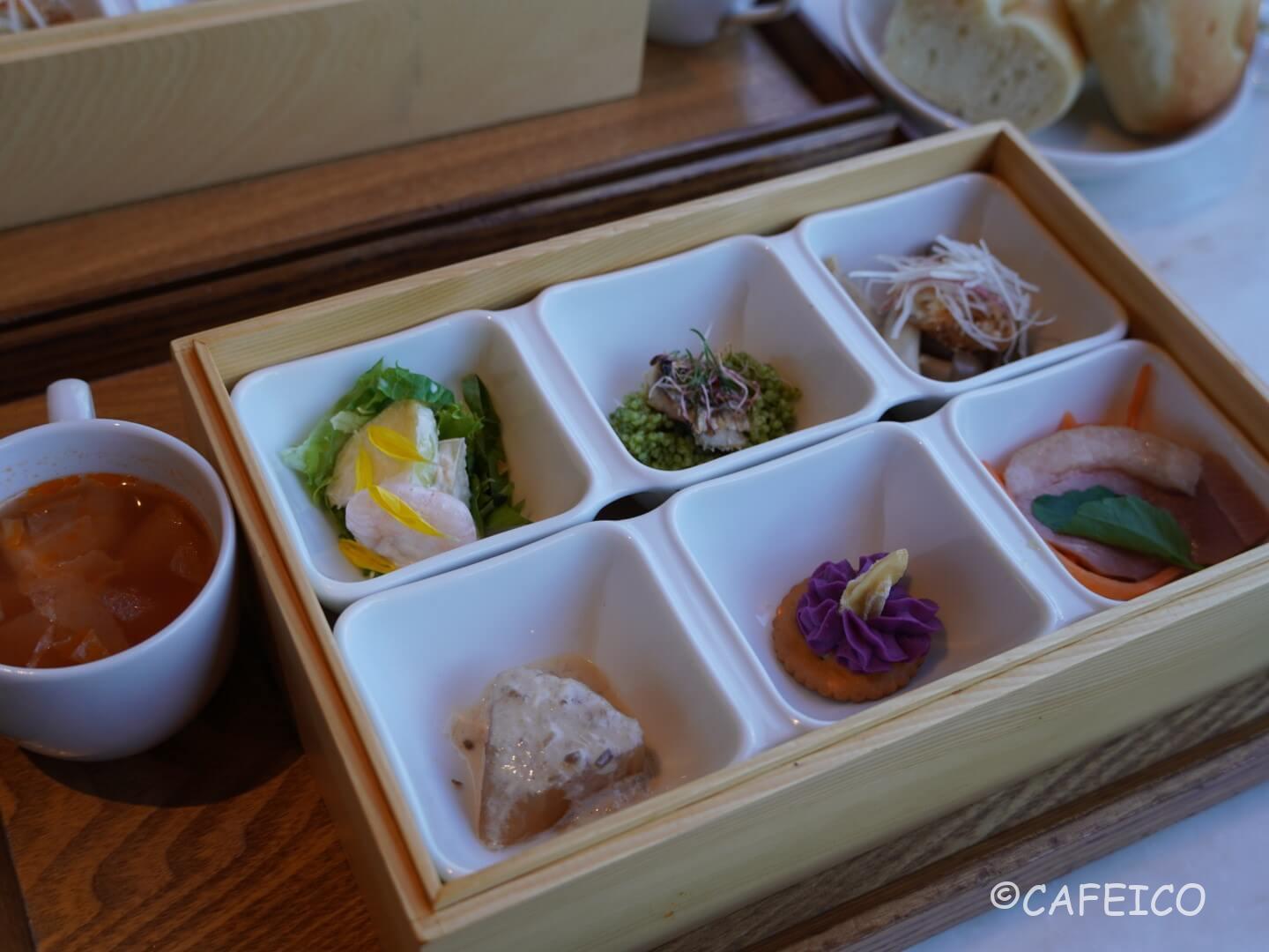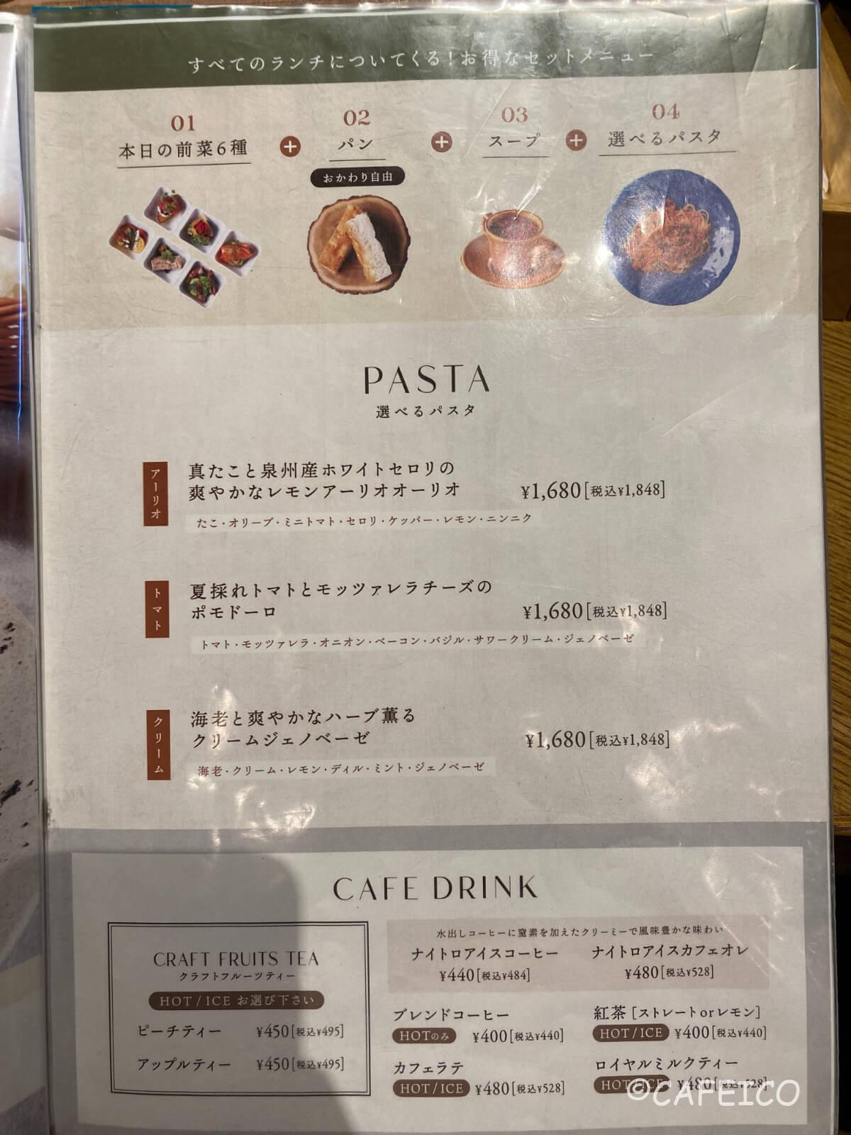 ランチメニューは「前菜6種+パン+スープ+パスタorメイン」です。