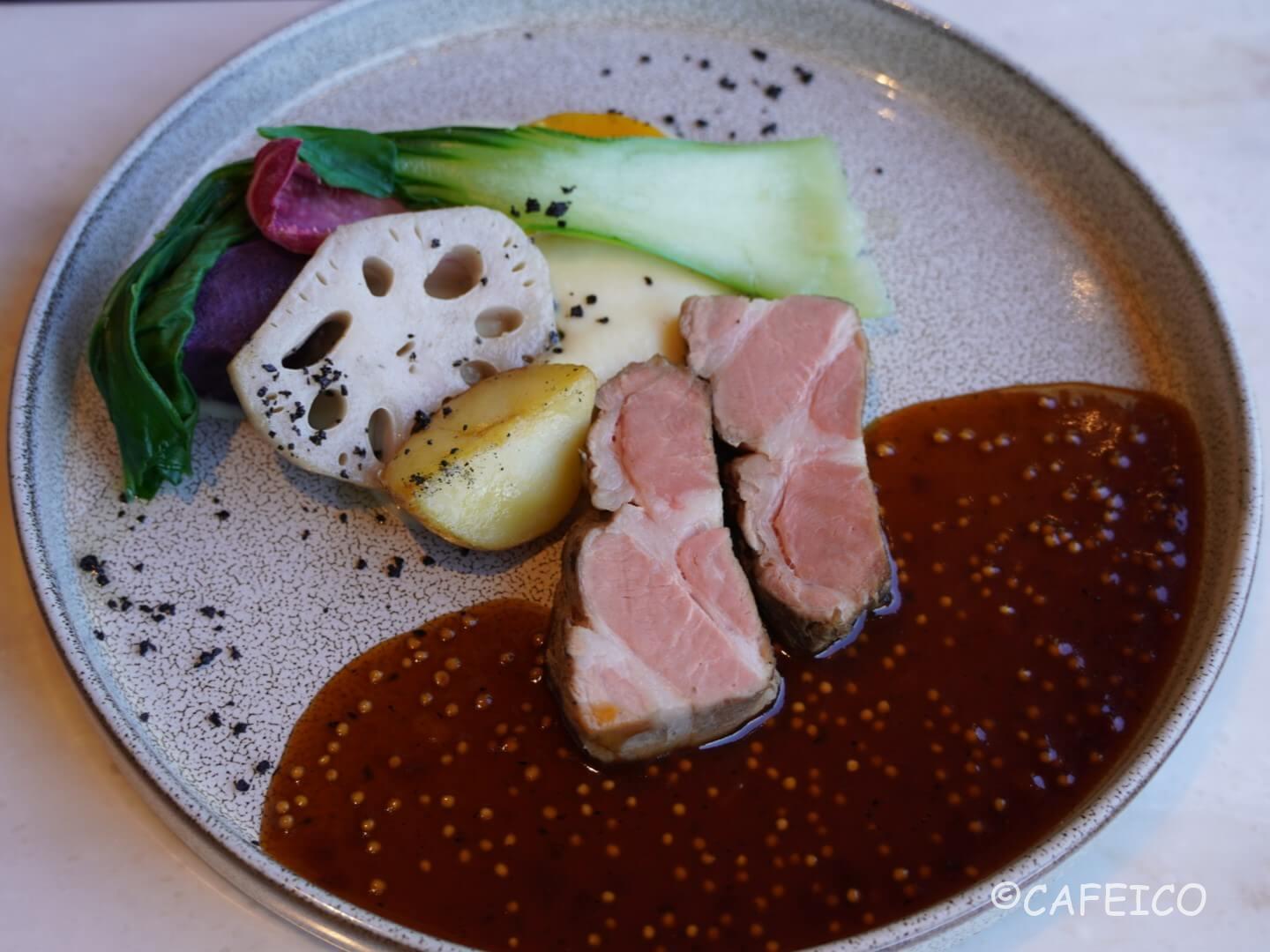 こちらはメインセット。アンデス高原豚の炭焼きと窯焼き野菜。ソースはハニーマスタードでした。