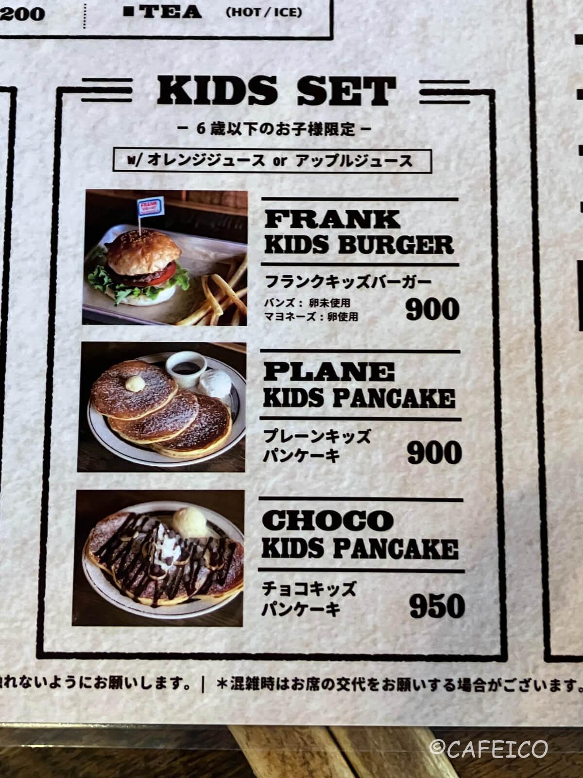 キッズメニューはハンバーガーとパンケーキから選ぶことができます。