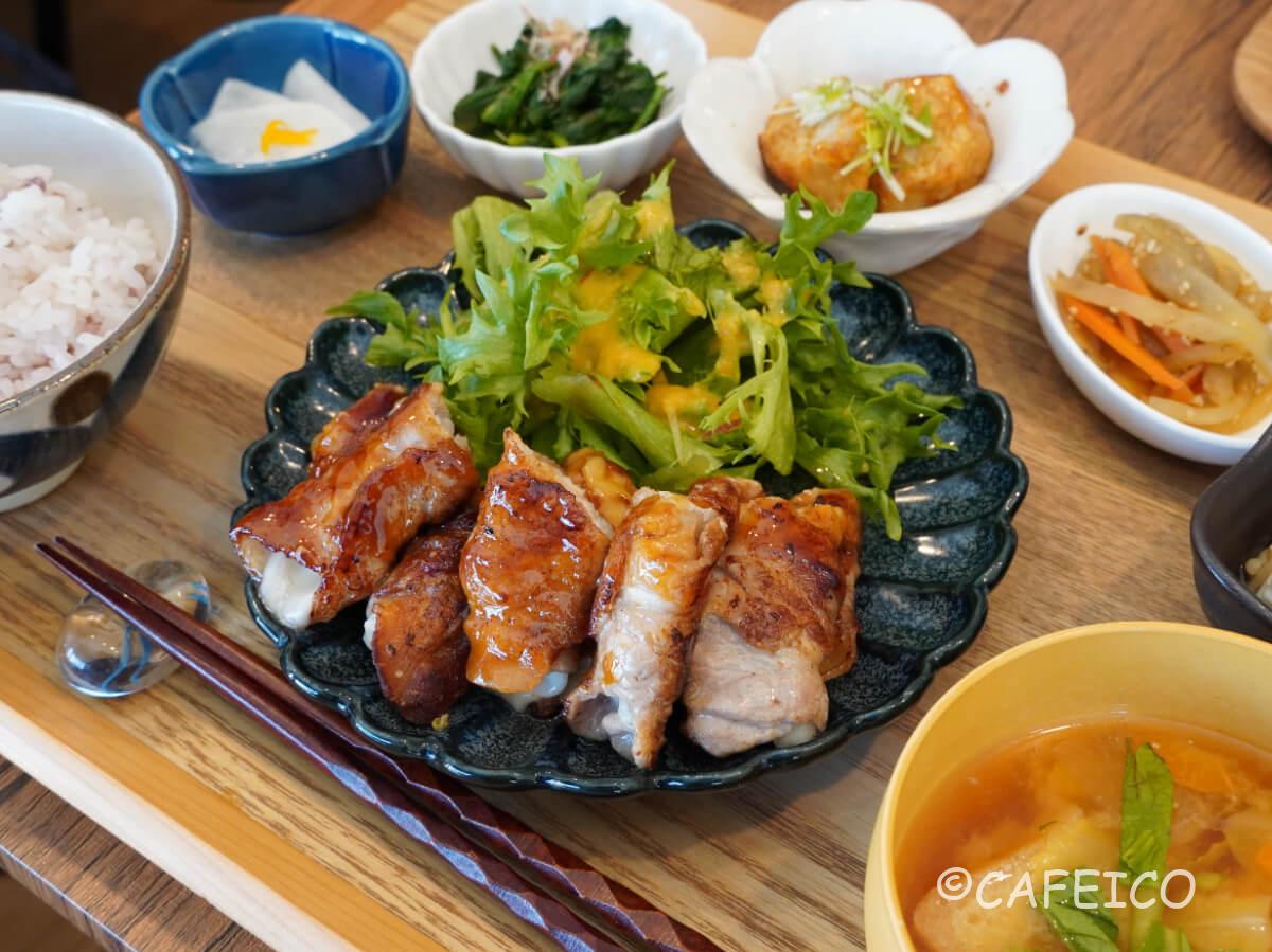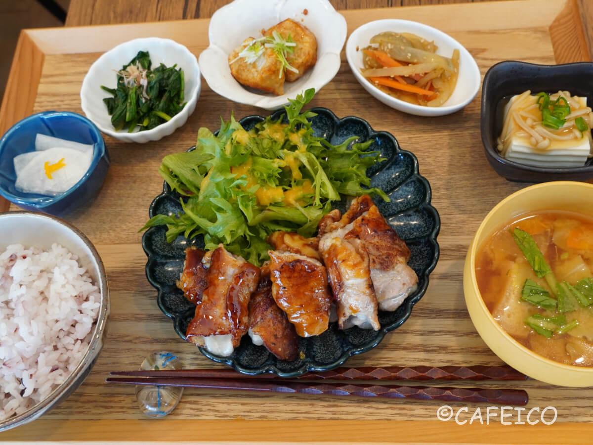 私は豚バラのチーズロールを選びました。副菜がいっぱいで見るからに健康的なランチです!
