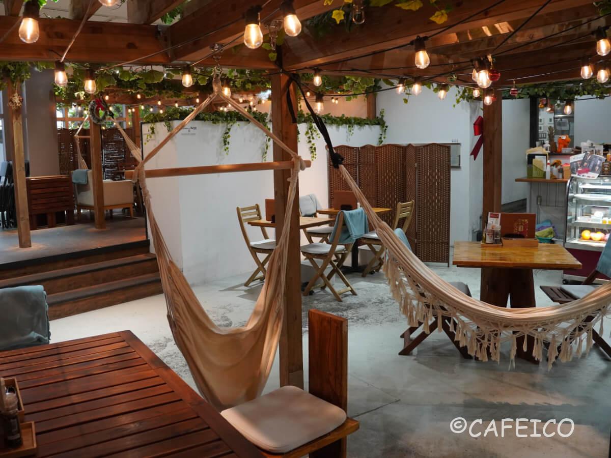 まるでグランピング?緑とハンモックに囲まれた非日常空間