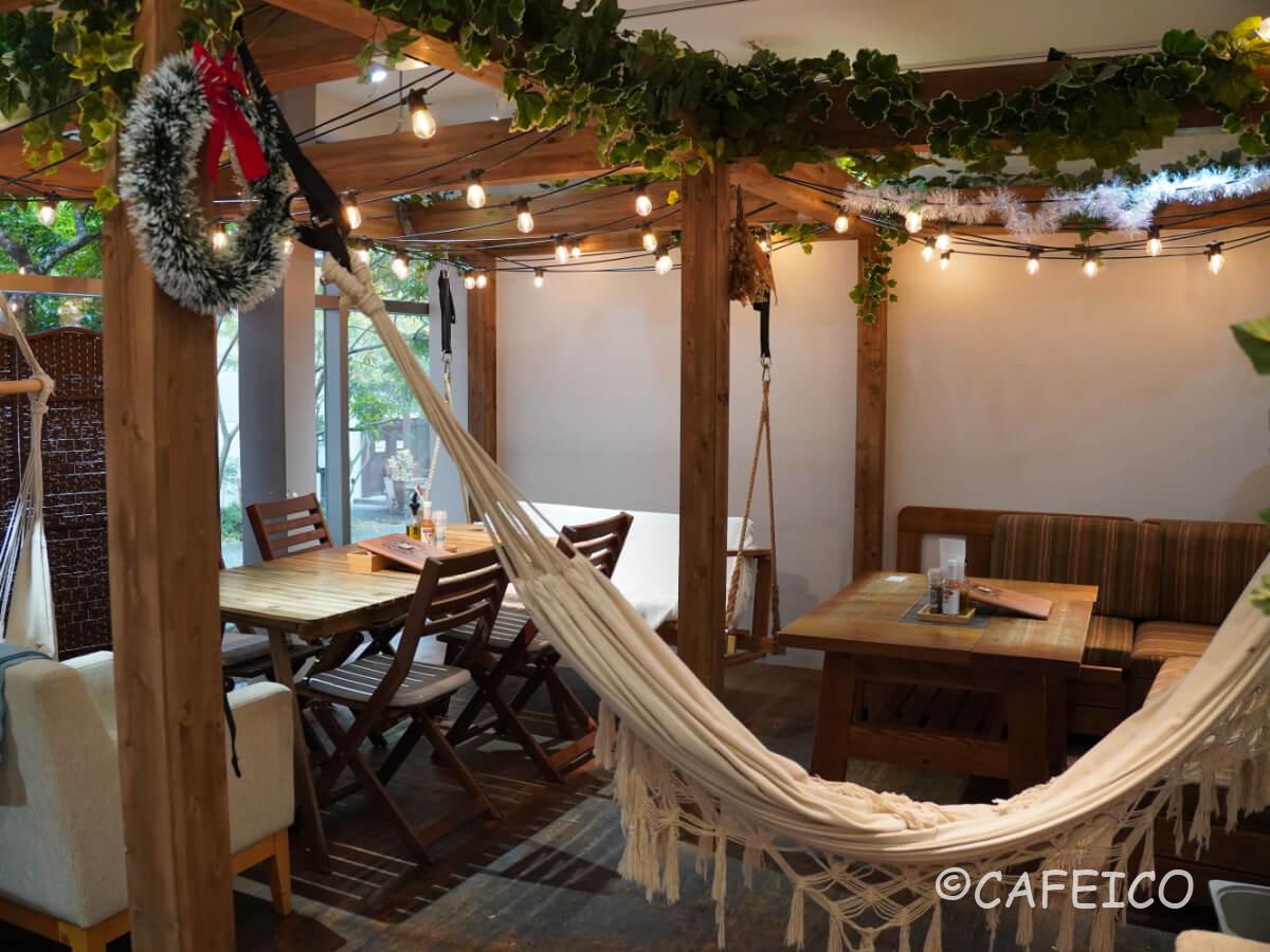 緑とライトとハンモックで、まるでグランピングに来たみたいな雰囲気。