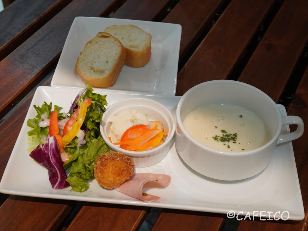 週替わりパスタは、前菜とスープ、バケット、ドリンク付きです。