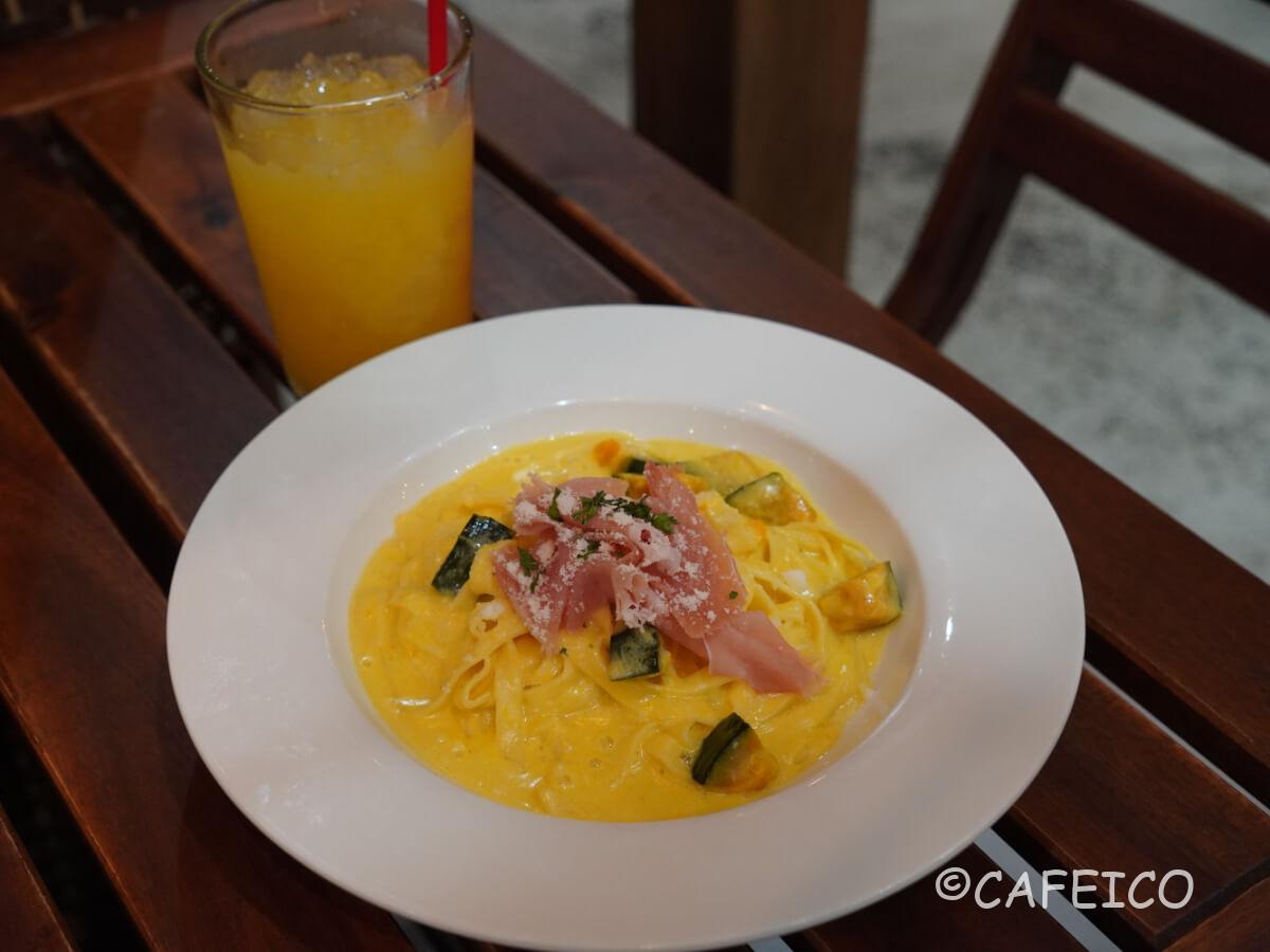 週替わりのパスタはもちもち生麺。この時は、かぼちゃパスタ。甘めのかぼちゃクリームソースと生ハムの塩っ気がいい感じ♪