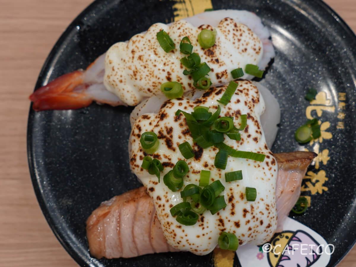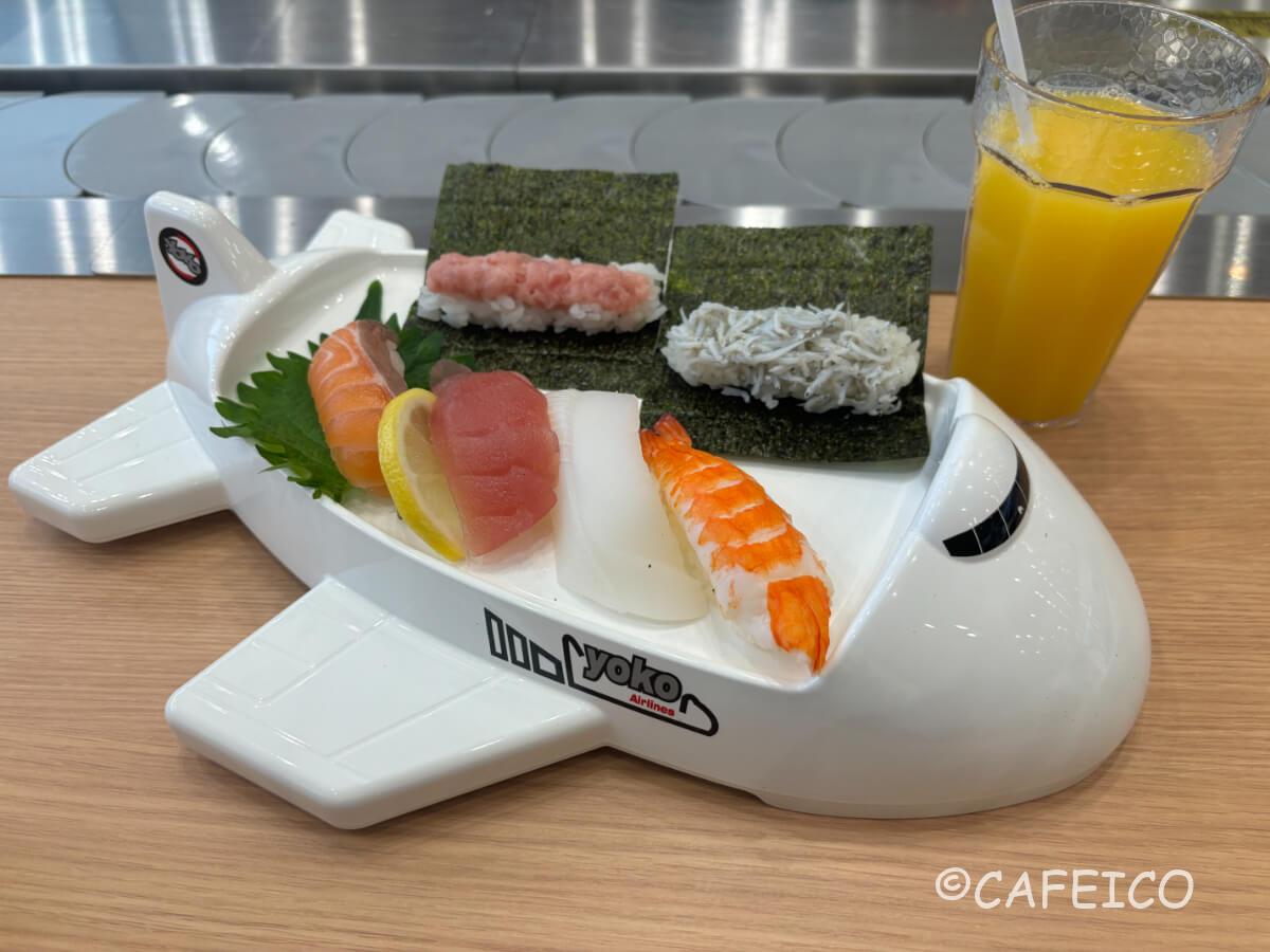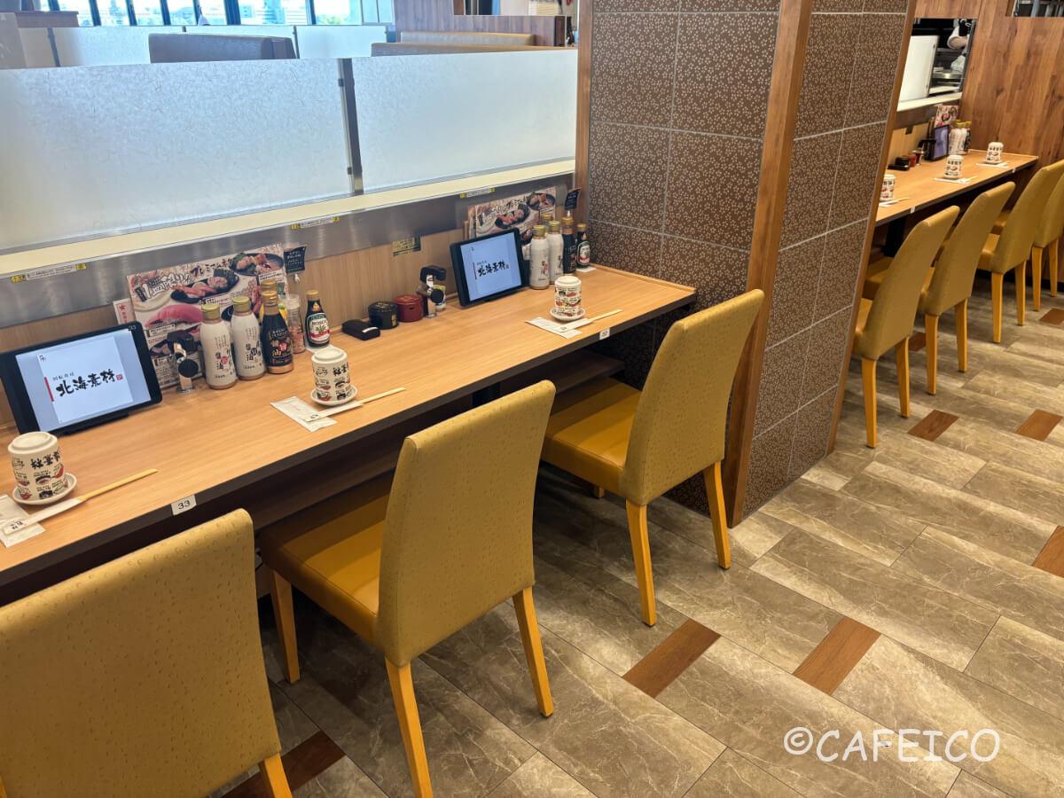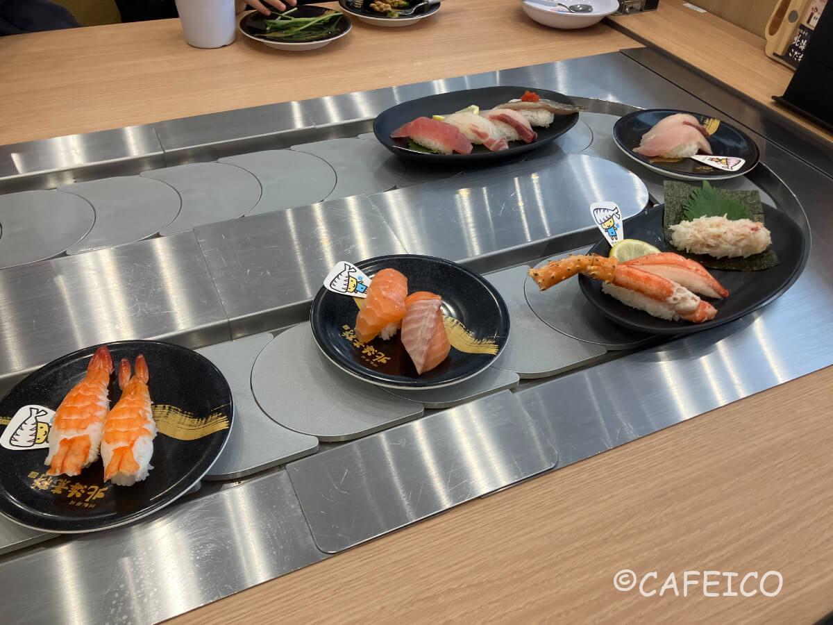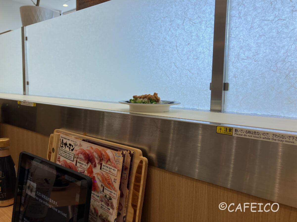 こちらのお店でびっくりしたのは、各テーブル席の上に回転レーンがあること!