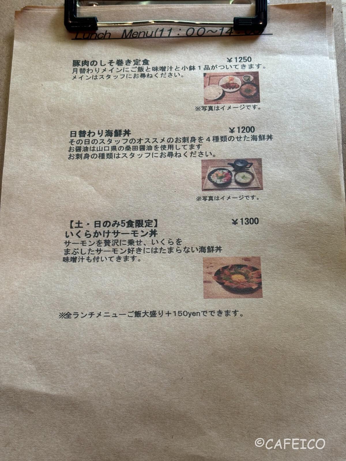 お料理メニューは「月替わりの定食」と「日替わりの海鮮丼」から選びます。