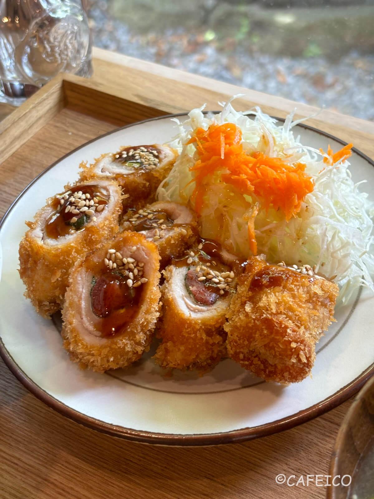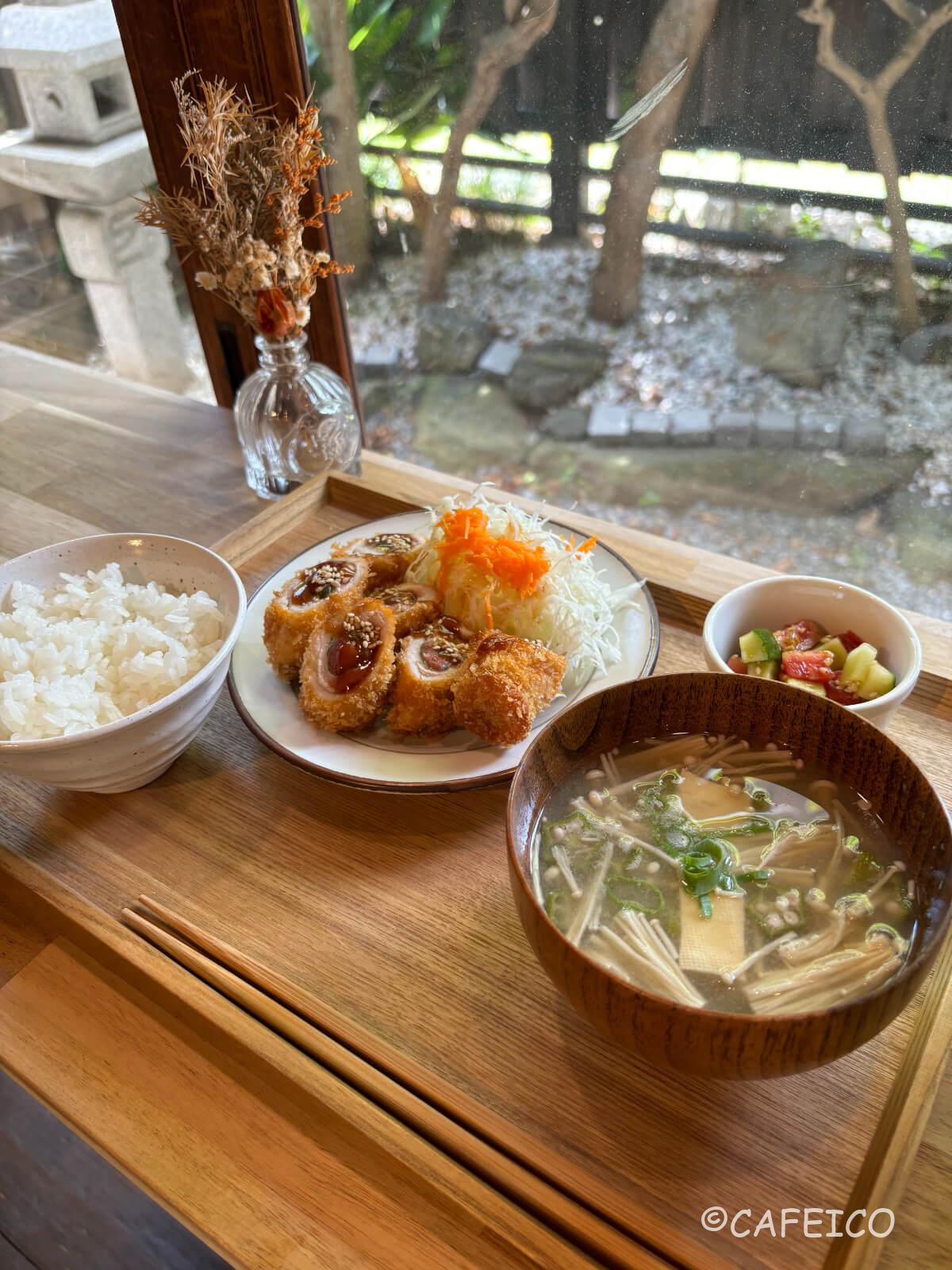 こちらが「豚肉のしそ巻き定食(税込1,250円)」です。月替わりのメインに、お味噌汁と小鉢付き!