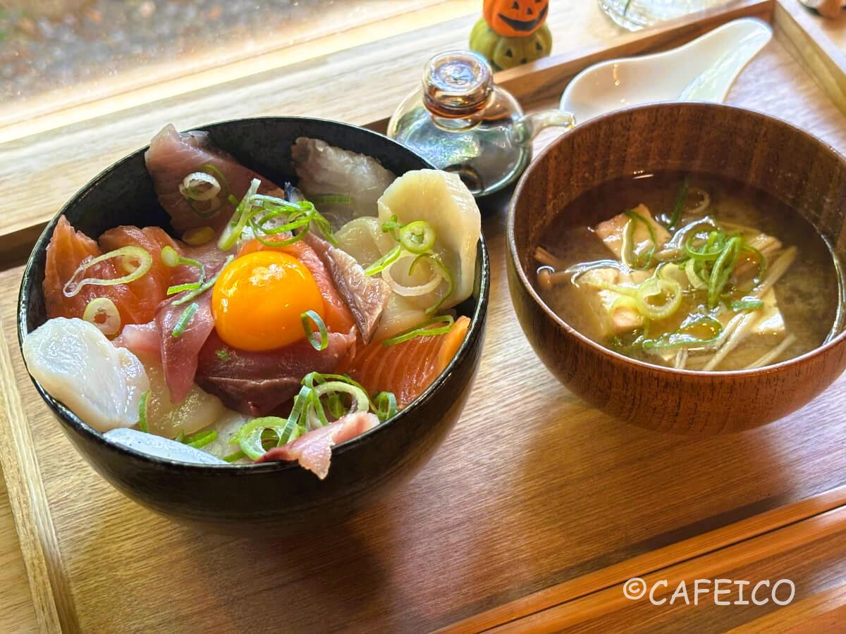 その日のスタッフさんのおすすめの刺身4種が盛られています。カフェで海鮮丼が食べれるなんて新鮮♪