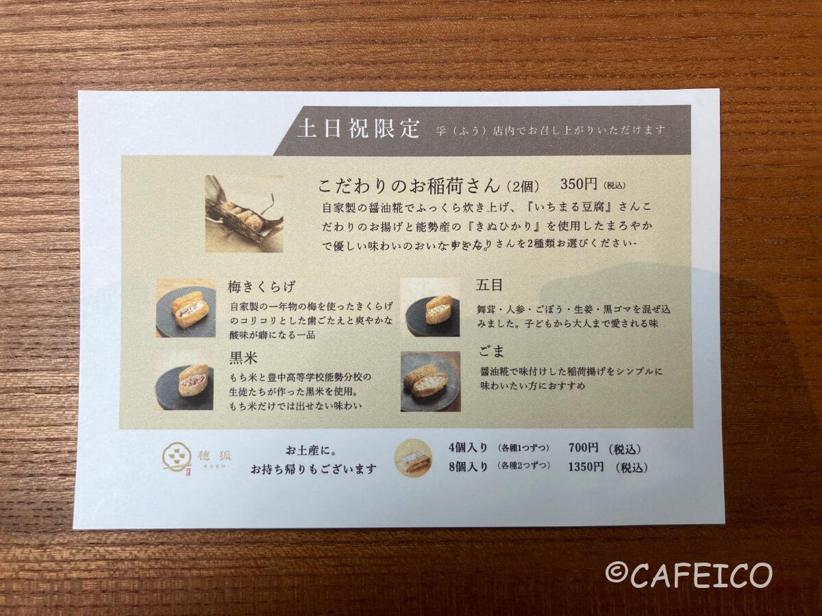 通常はテイクアウト専門の「穂狐」で食べれる いなりずし なのですが、土日限定でレストラン内で注文できます。