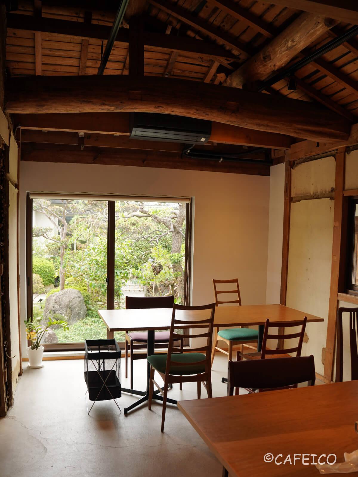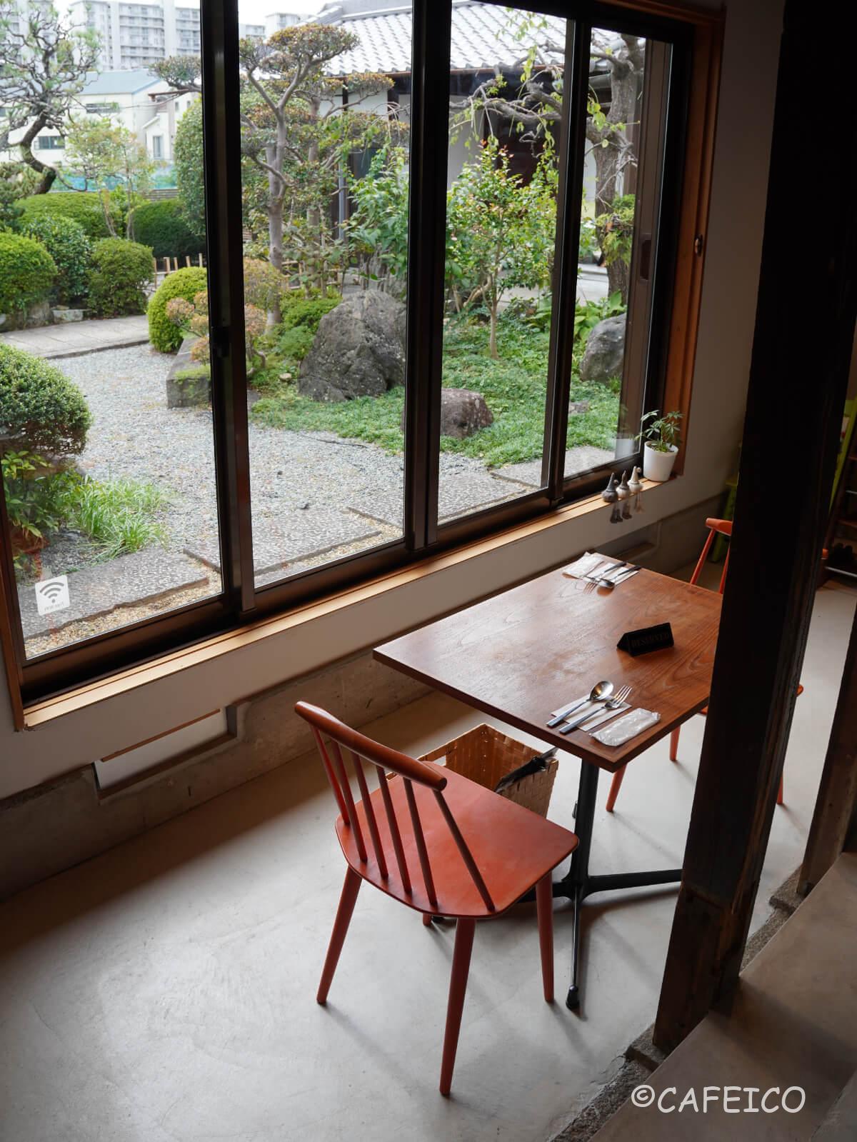 大きな窓からお庭が見えるテーブル席。