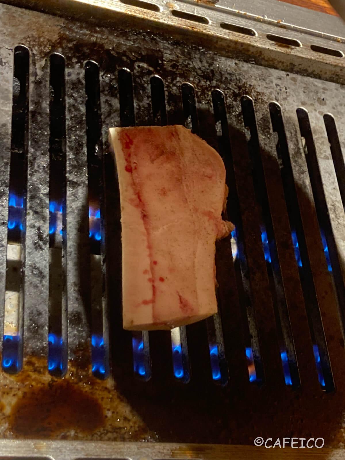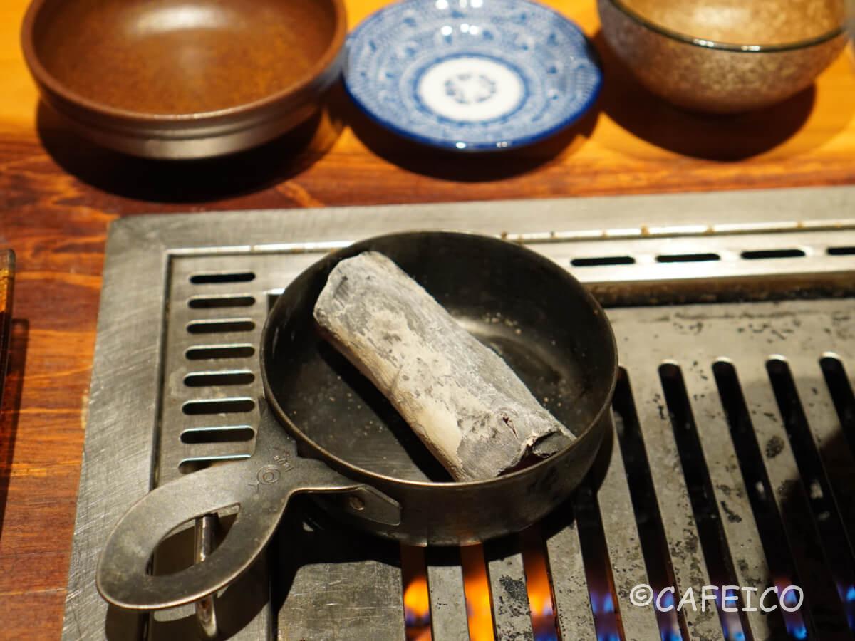 焼いたらこの炭にお肉をバウンドさせて香り付けさせます!