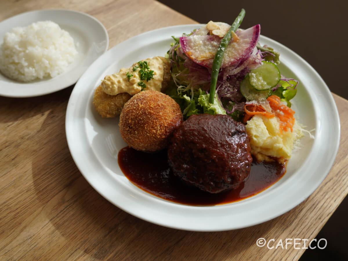 ランチメニューは主に2種盛と3種盛です。おすすめはハンバーグ定食。