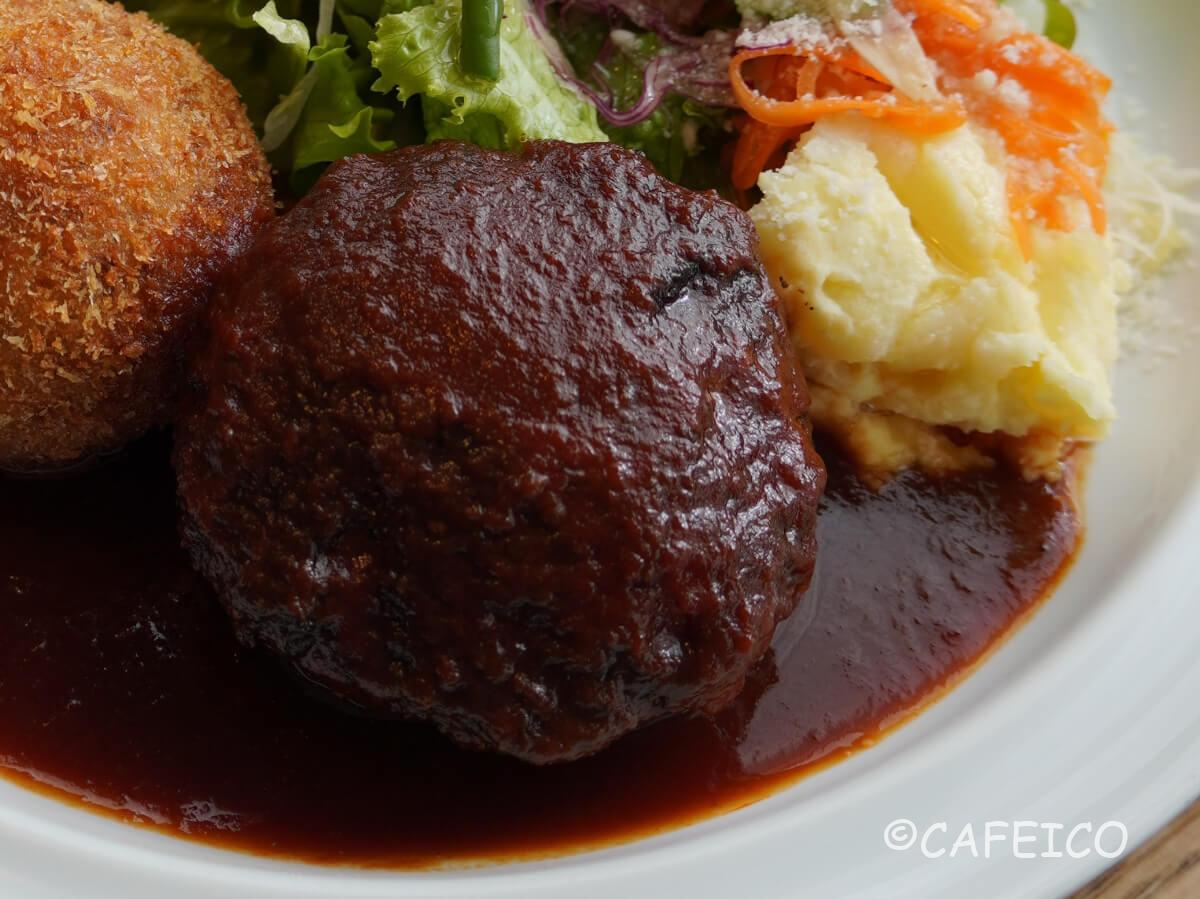 ハンバーグはまんまるで割るとジュワッと肉汁が。デミグラスソースも自家製です。