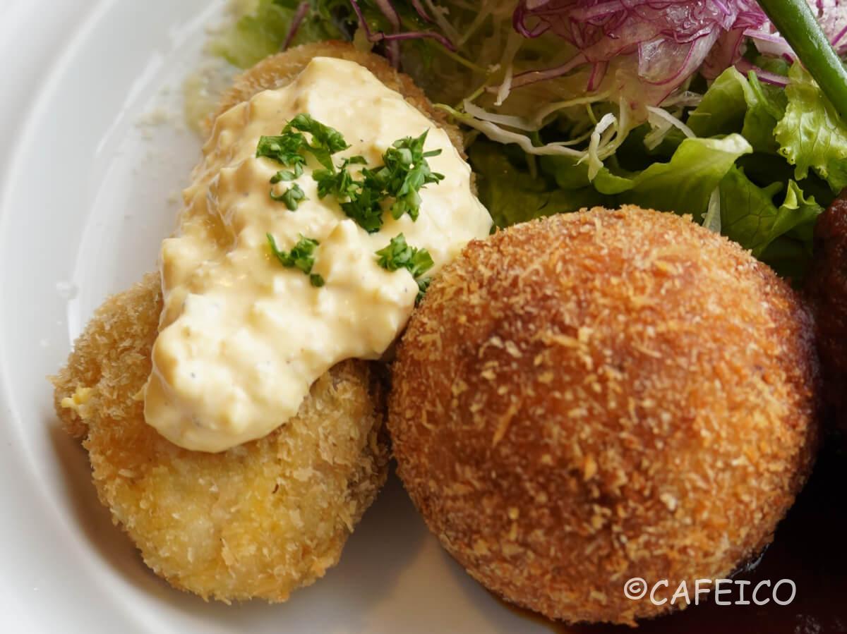 ビーフコロッケとシーフードコロッケ。揚げ油は100%米油。タルタルも自家製!