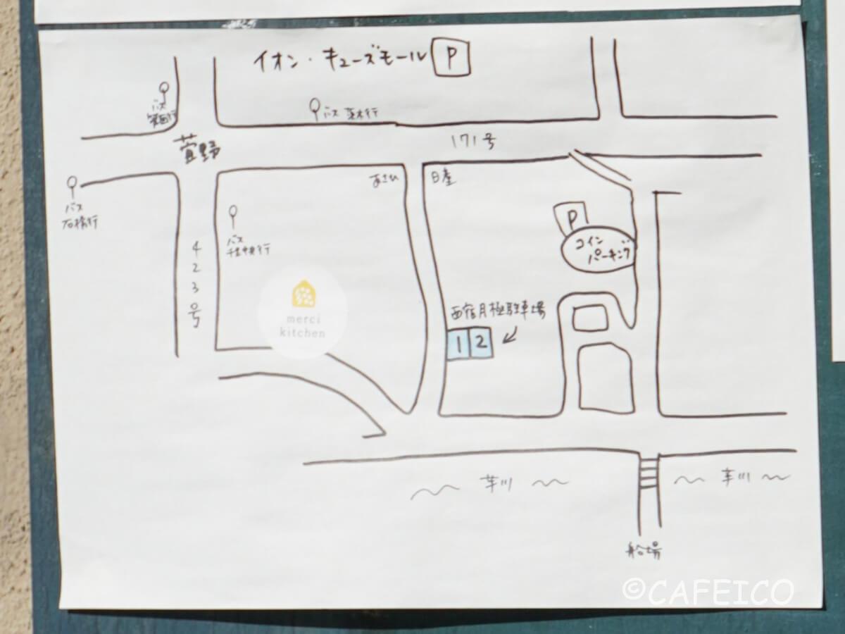箕面萱野駅を降りて、真っすぐ南に歩いて左折したところにメルシーキッチンがあります。だいたい7分くらい。