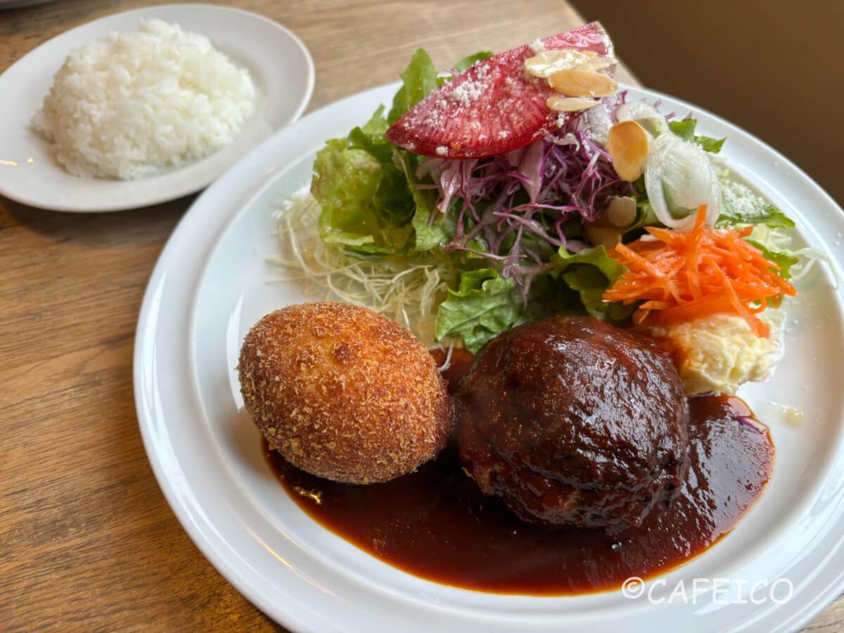 こちらはハンバーグ定食の2種盛り。私はこれくらいの量がちょうどかな。