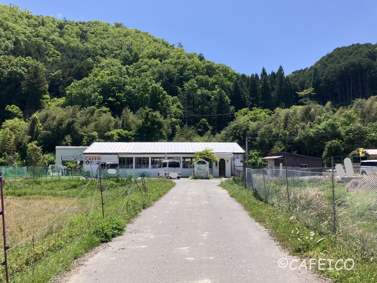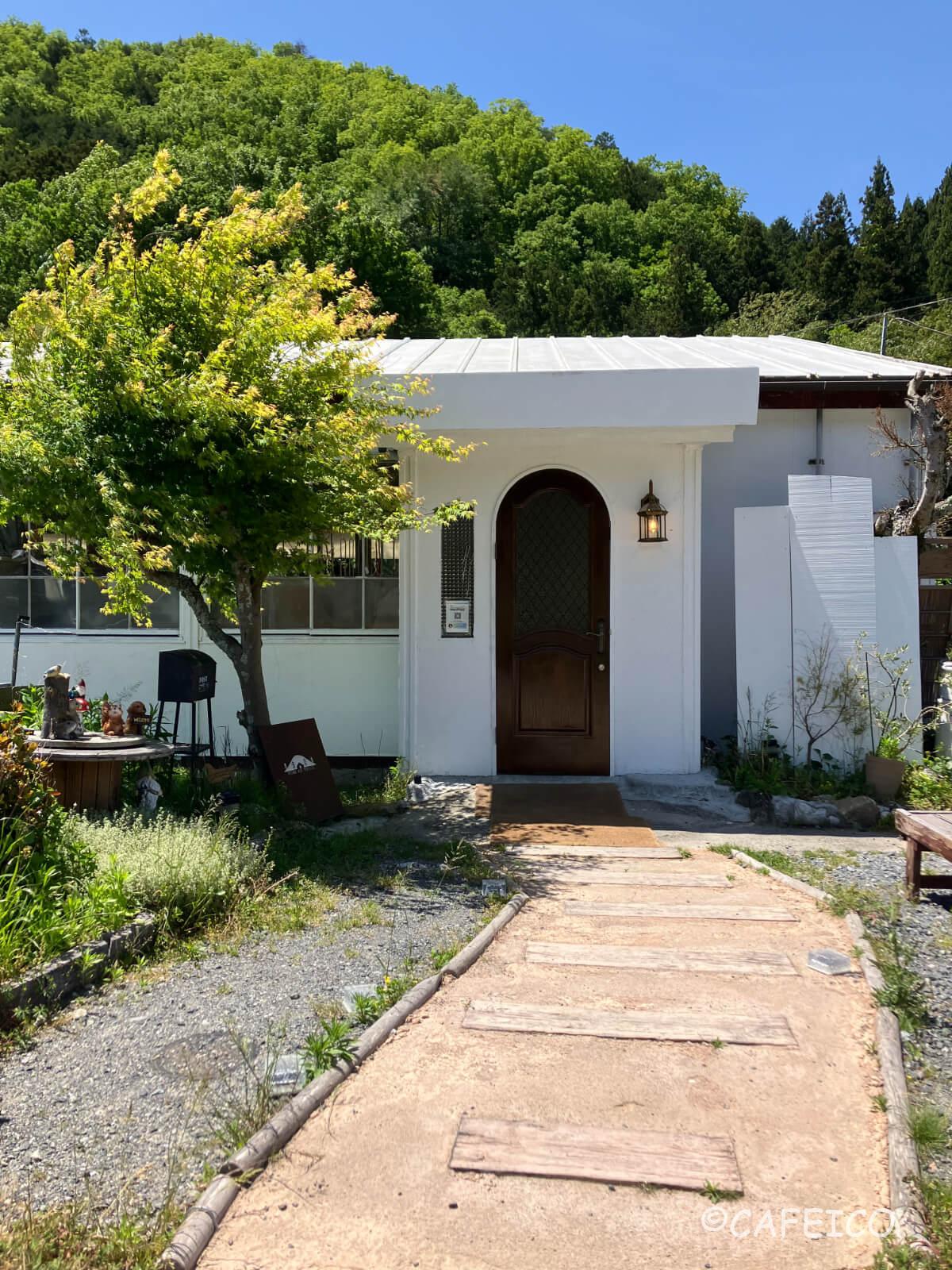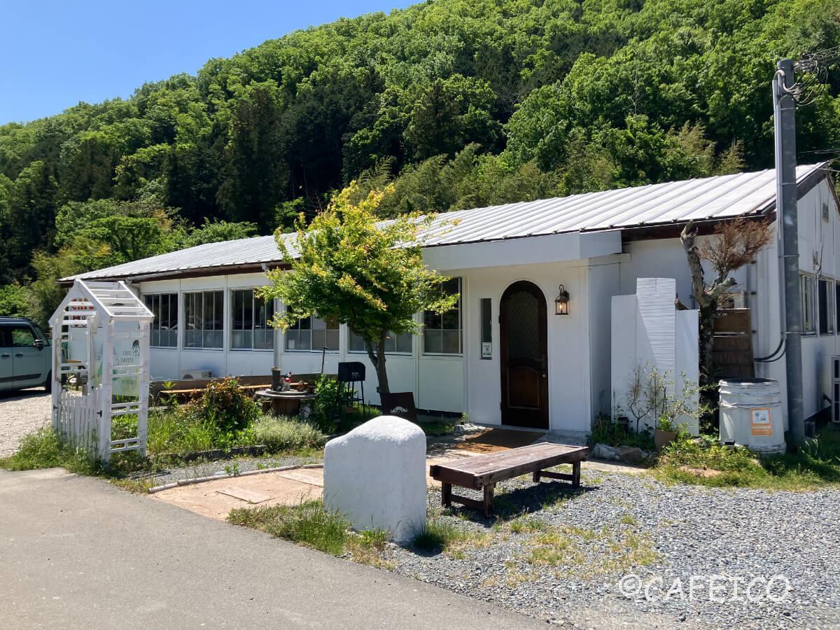 能勢の森と川と田んぼに囲まれた白い平屋のカフェ