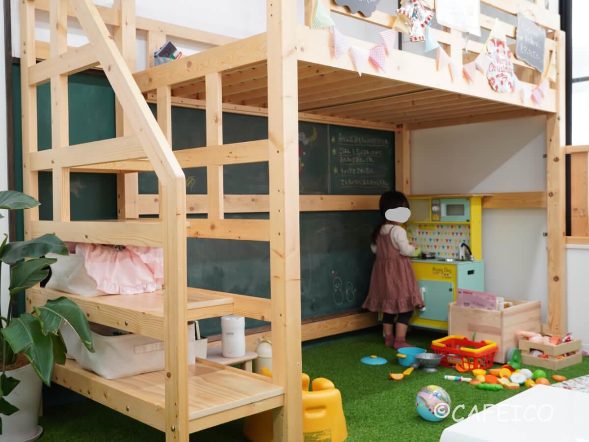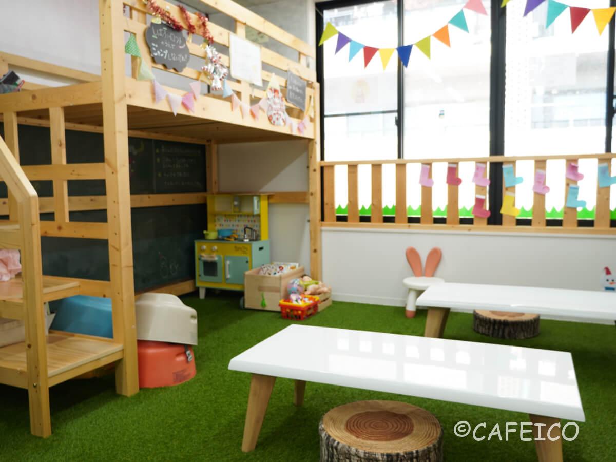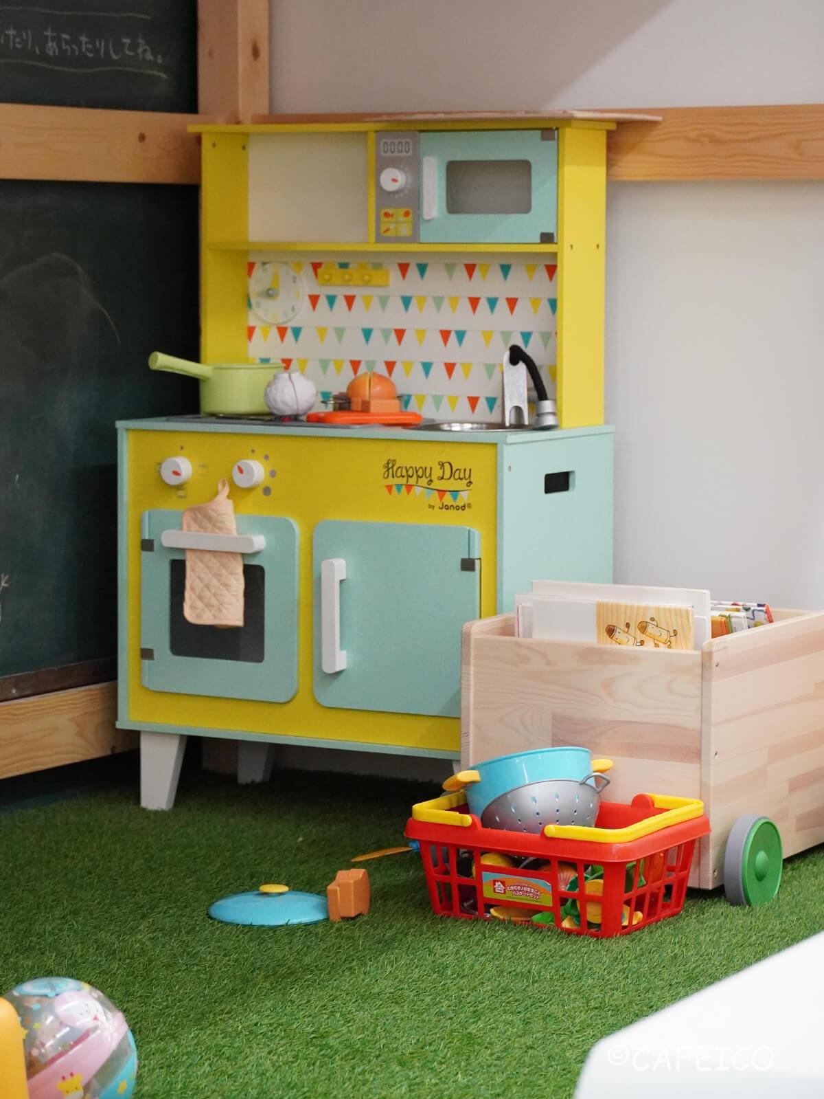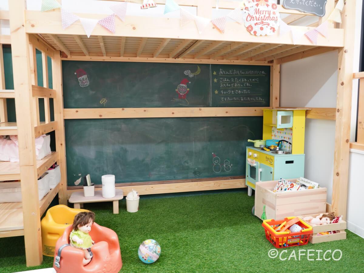 全体がキッズスペースのような可愛い空間で、お店には子供が楽しく遊べる工夫や、お母さんが快適に過ごすための設備が盛りだくさん!