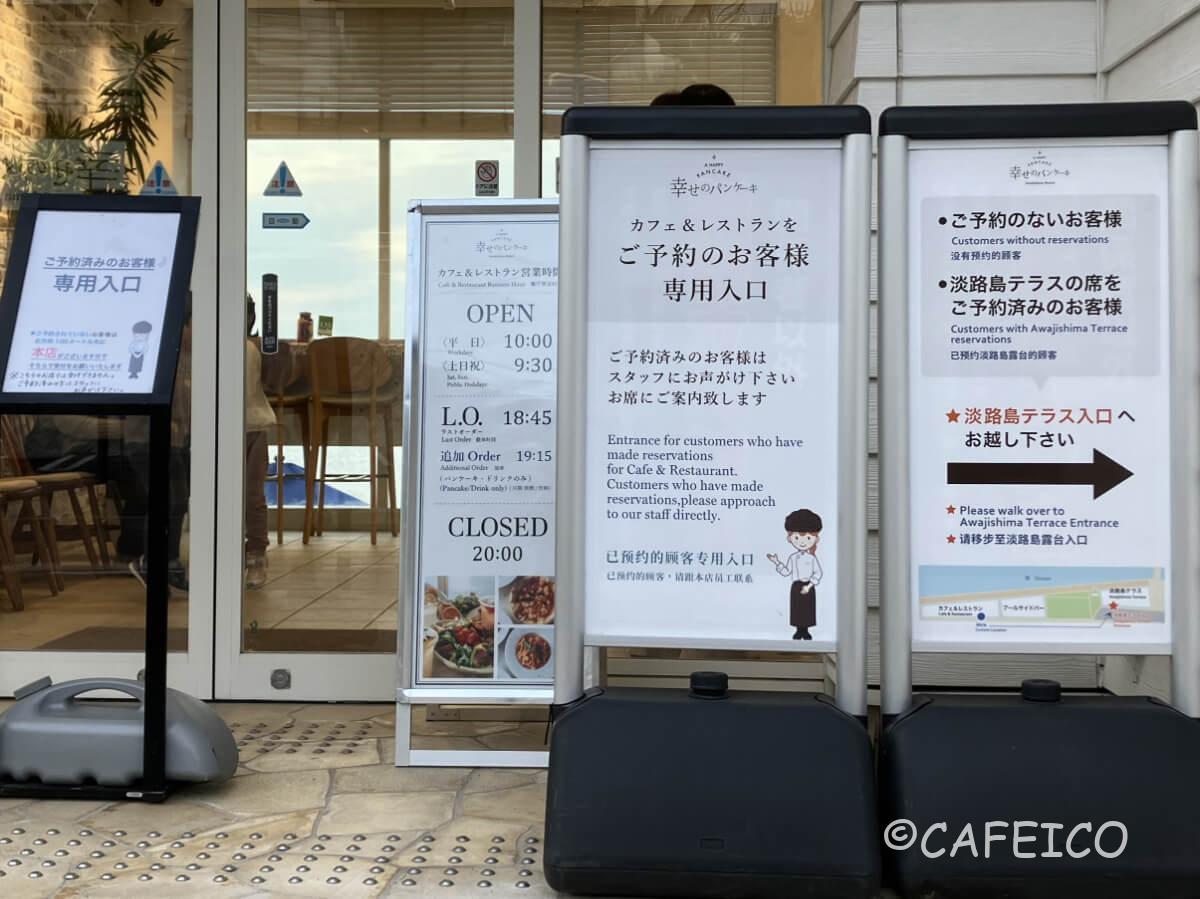 「予約者専用入口、予約してない方は淡路島テラス(先ほどのカフェ)へ」と看板が、、