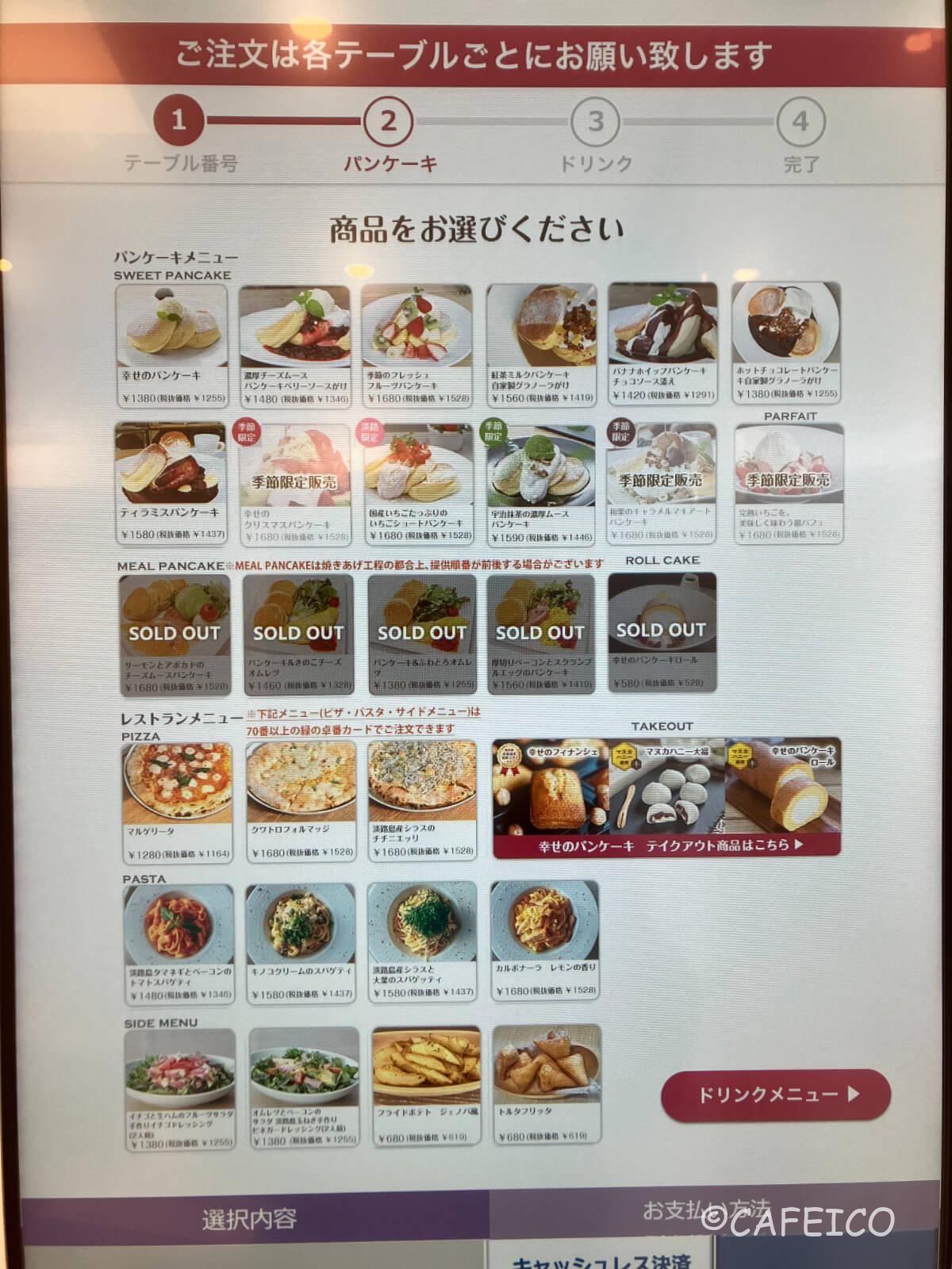 メニュー一覧です。淡路島店の限定メニューにするか、定番メニューにするか、とても悩みました。ピザやパスタの食事メニューも豊富なので、事前に決めておきましょう。