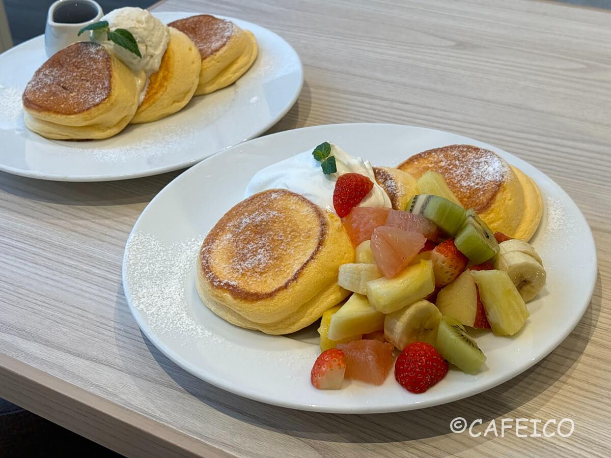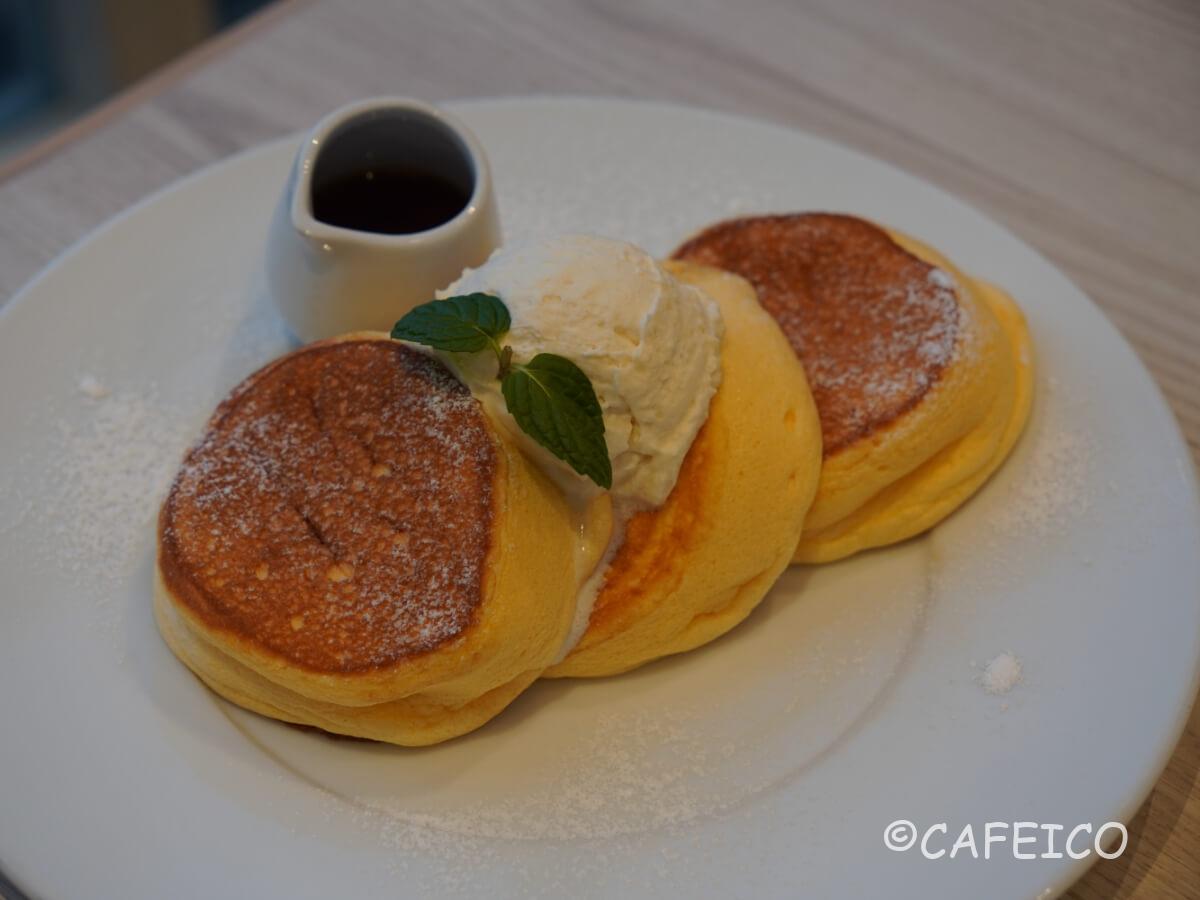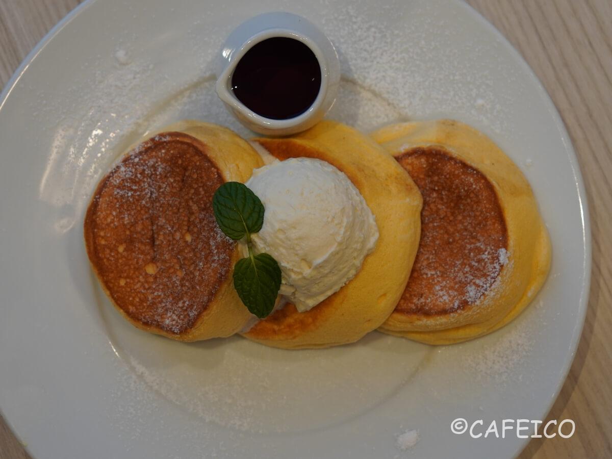 お店の名前が付いたパンケーキ。ベイキングパウダーを使用してないのにふわっふわです!