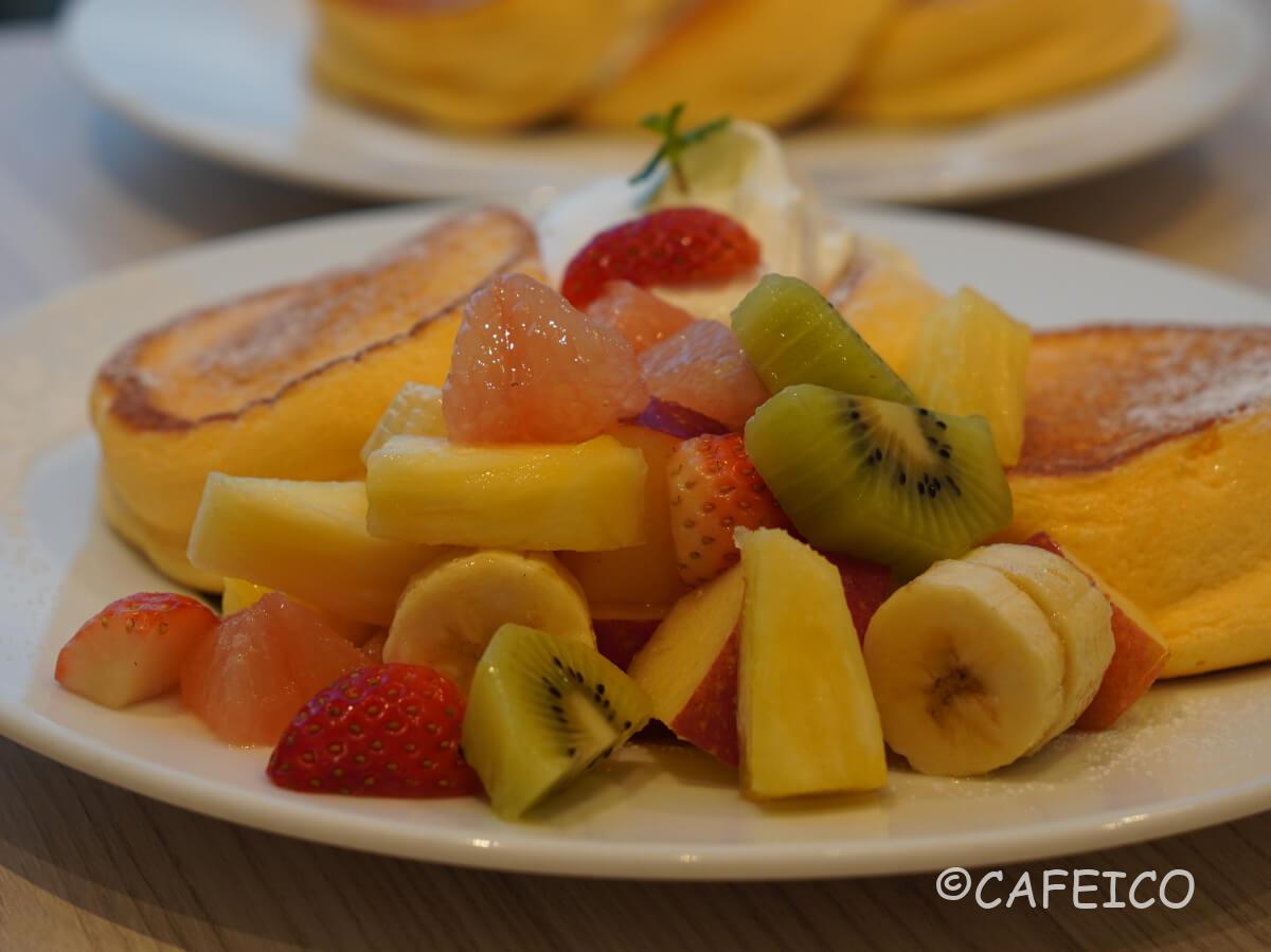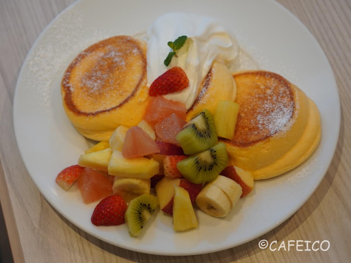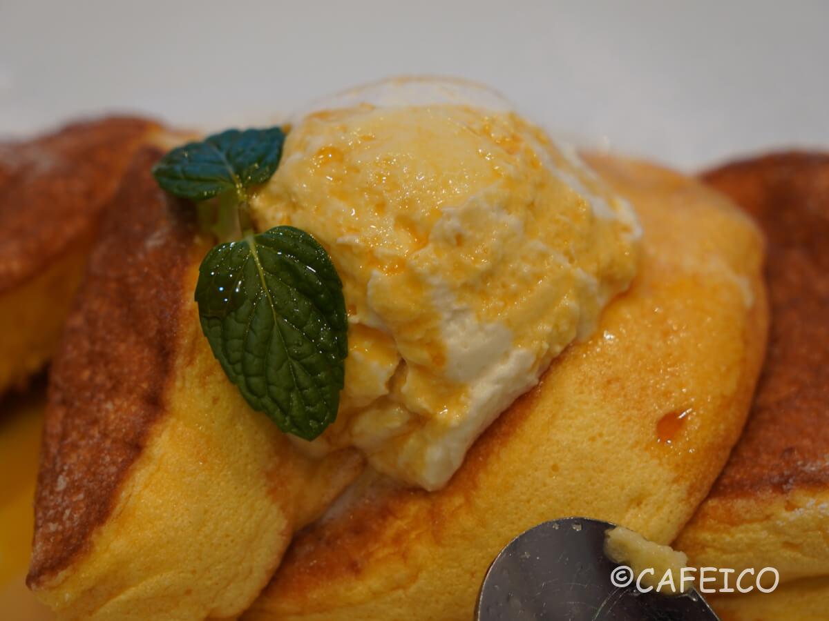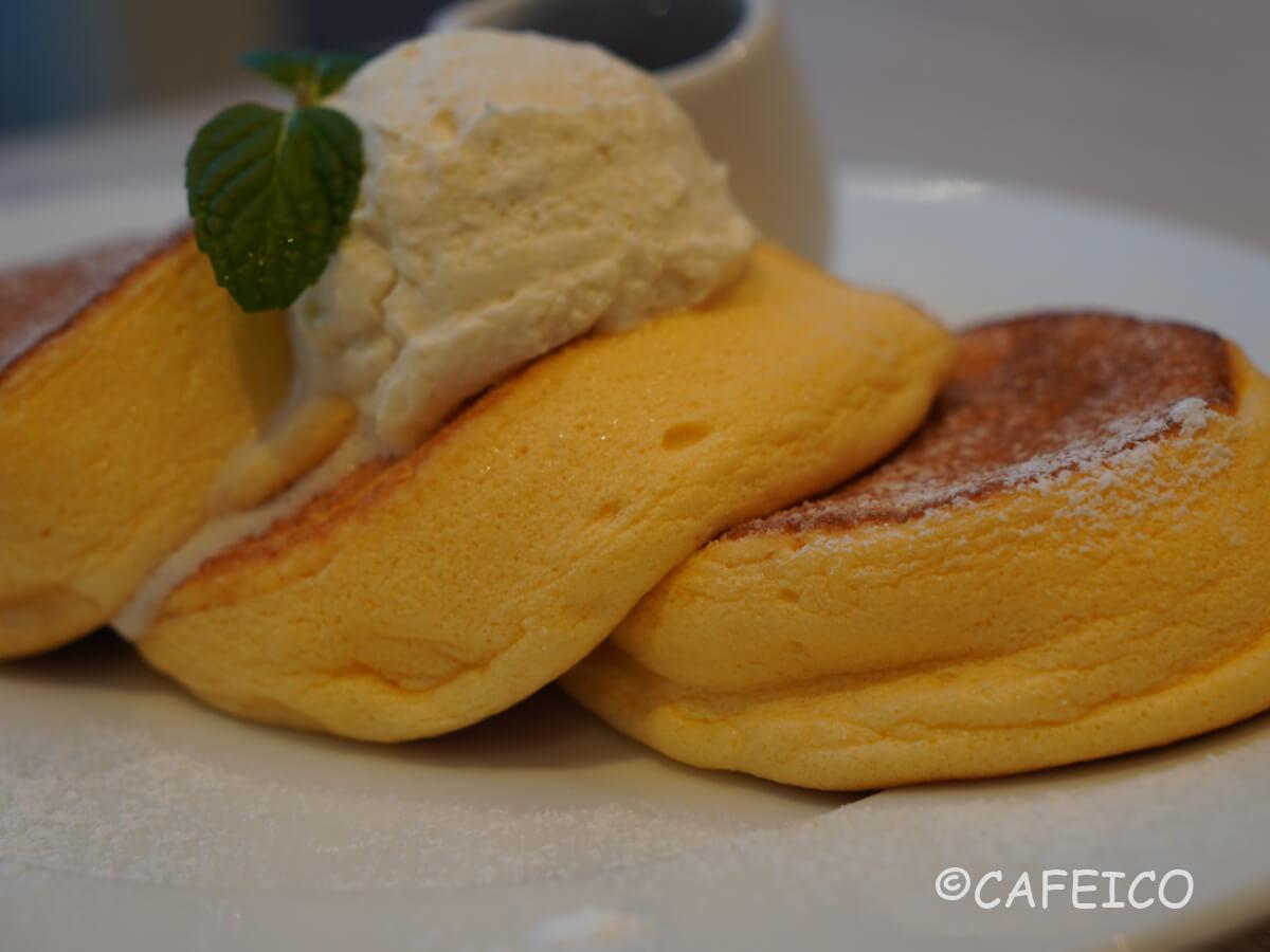 お店の名前が付いたパンケーキ。ベイキングパウダーを使用してないのにふわっふわです!