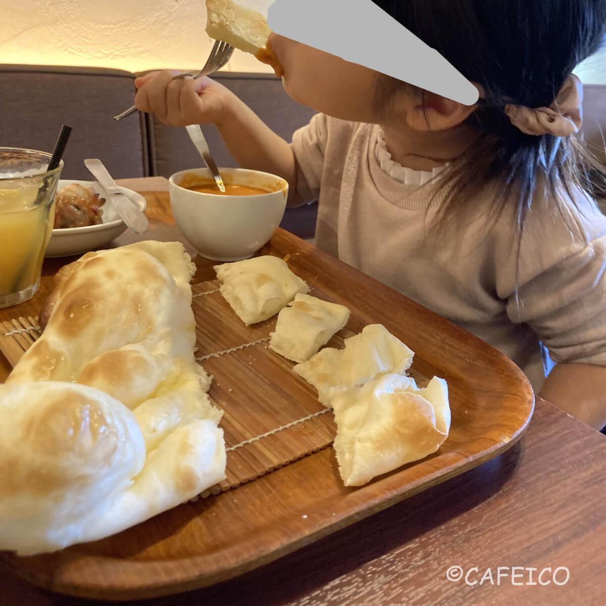 バターチキンカレーは子供も食べやすい味だし、初めてのナンもかぶりついてました。