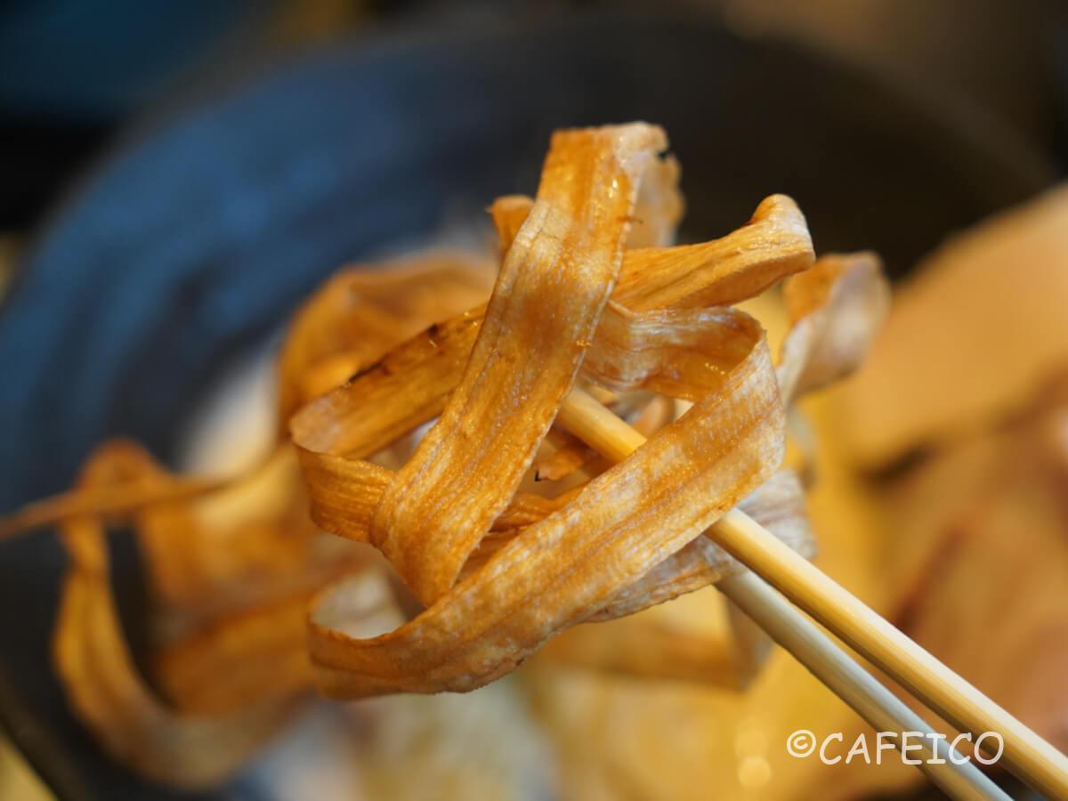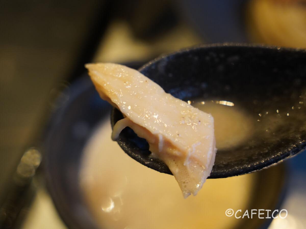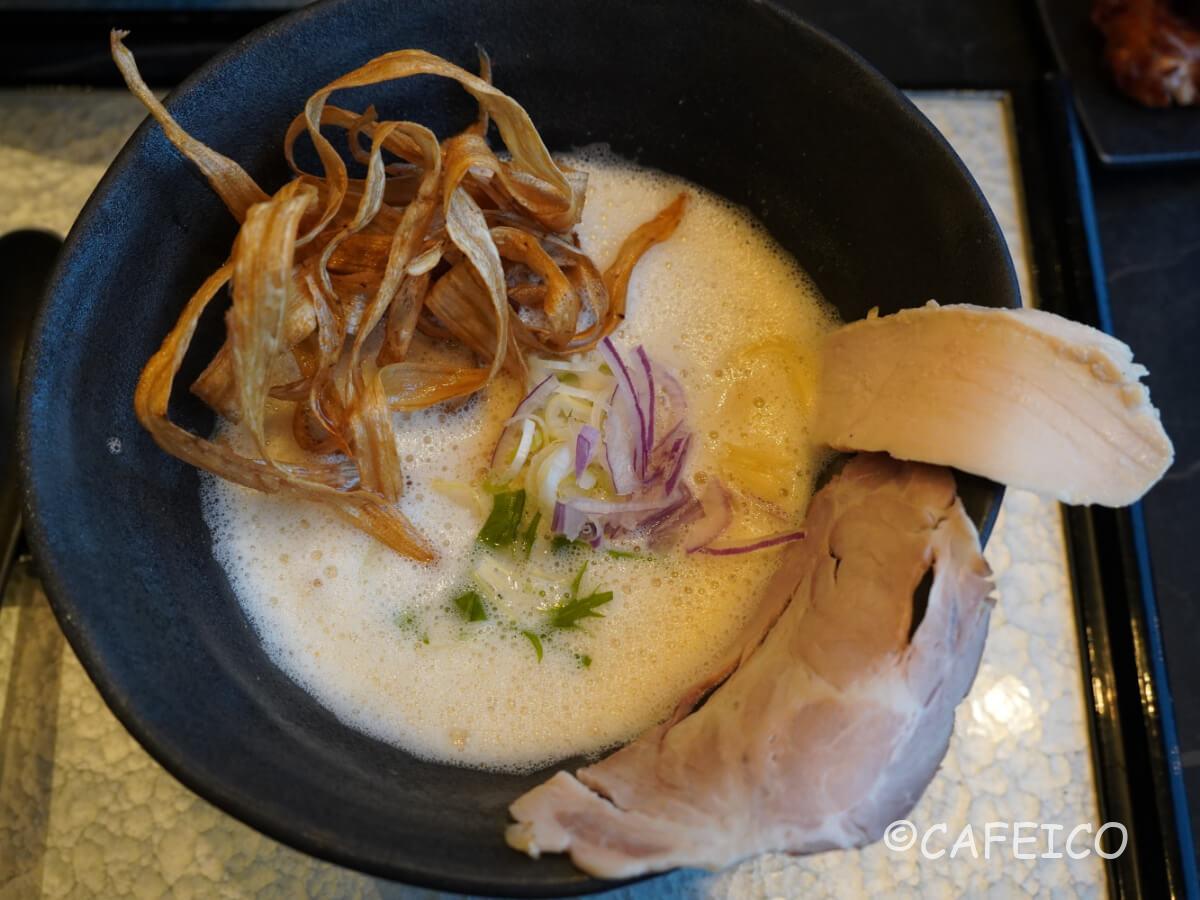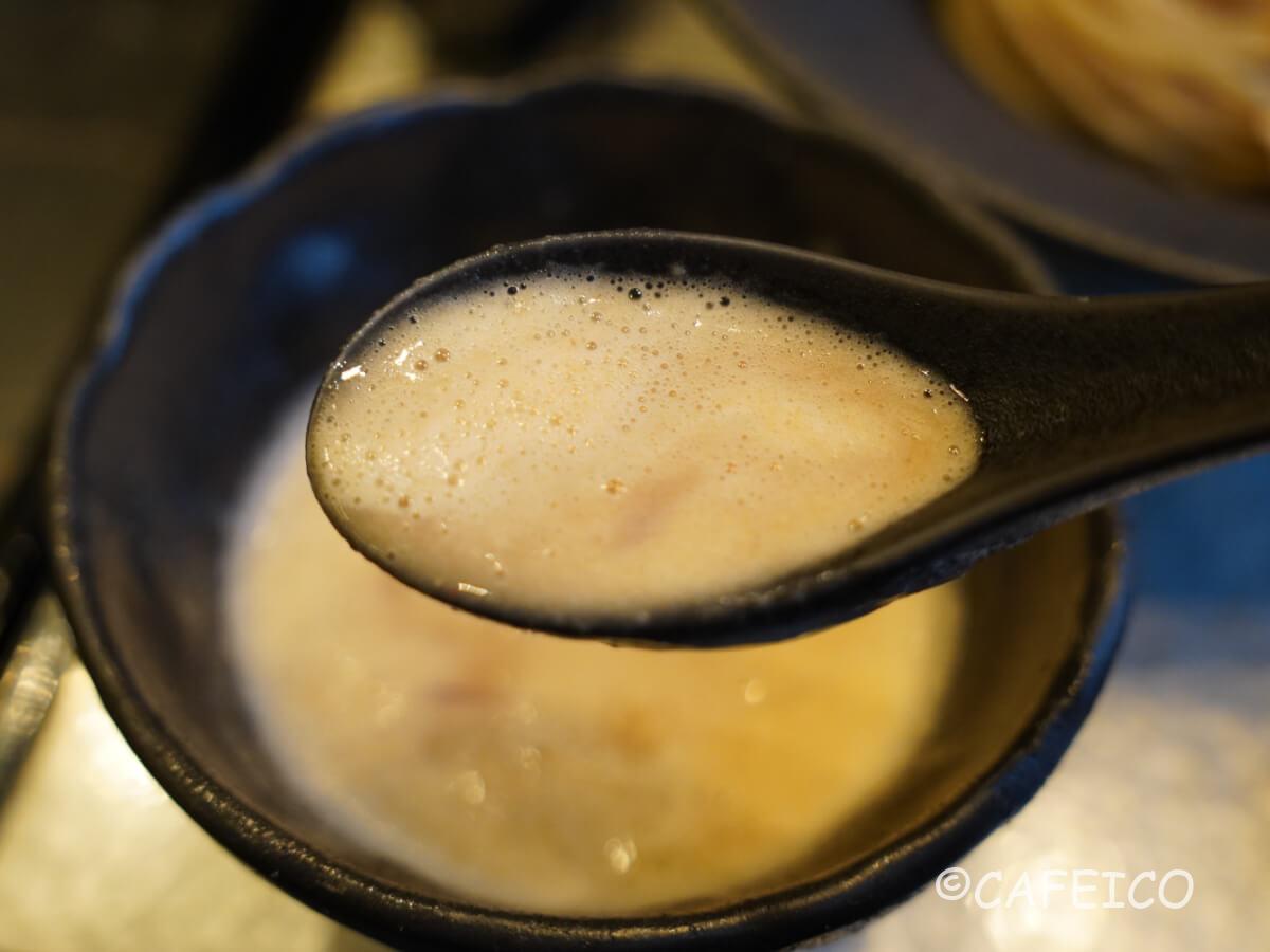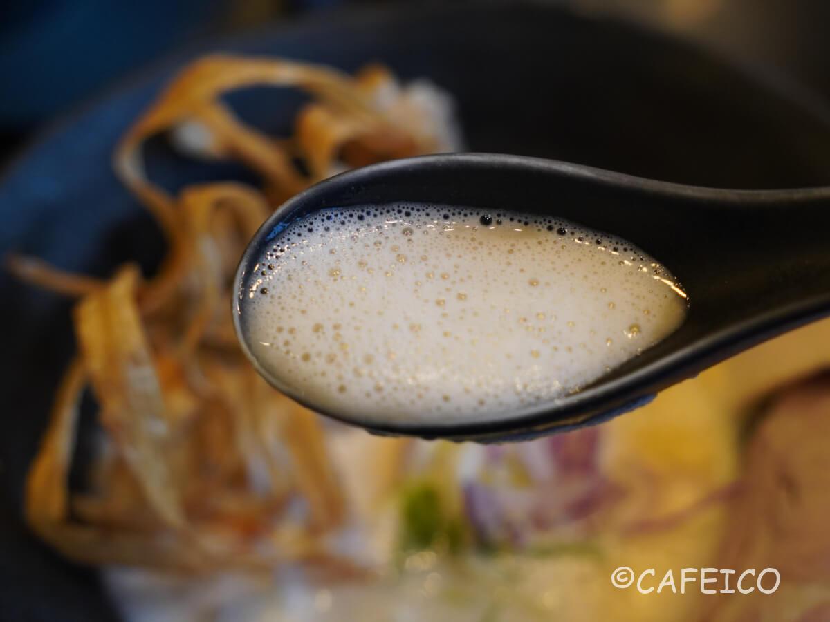 この鶏白湯スープは提供前にハンドミキサーで泡立ちさせてるみたいですよ。