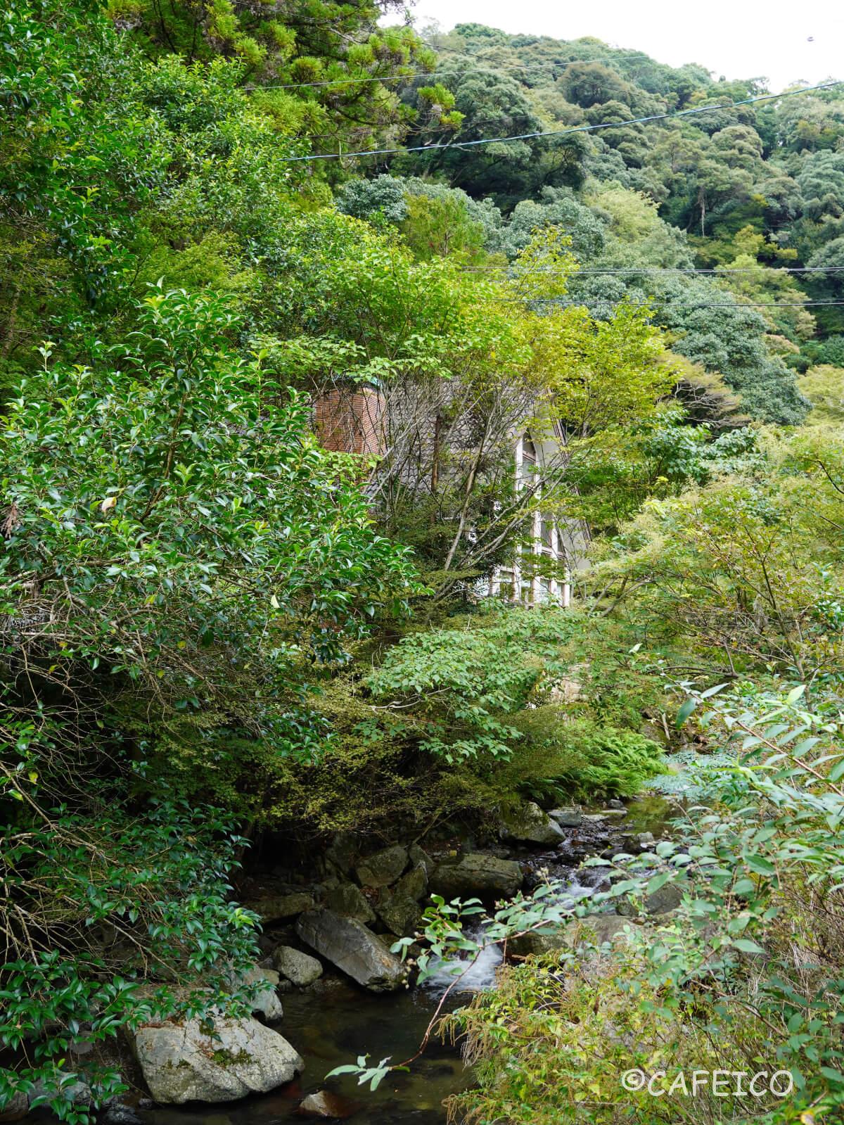 箕面から15分ほど箕面滝道を歩いていると、木々の中に埋もれている建物が見えてきました。