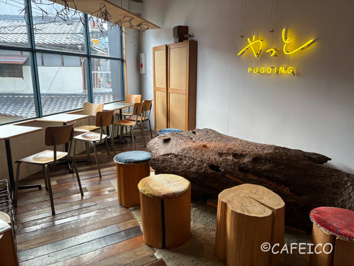 2階はイートイン。座席にも映え写真にもなる大きな木製オブジェがすごい