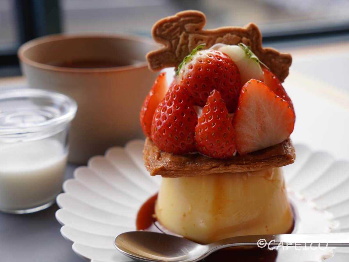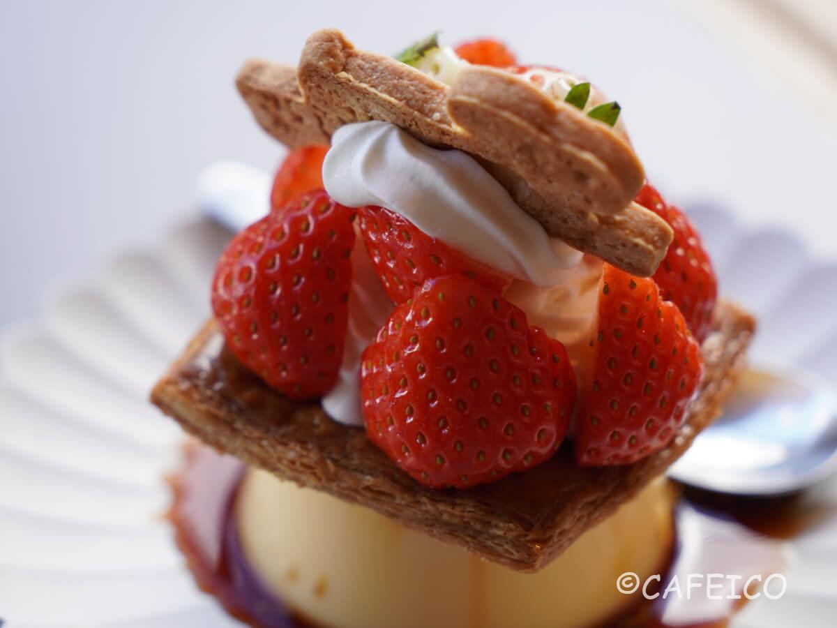 プリンの上にザクザクのパイ生地、その上にたっぷり苺とクリームの贅沢プリン