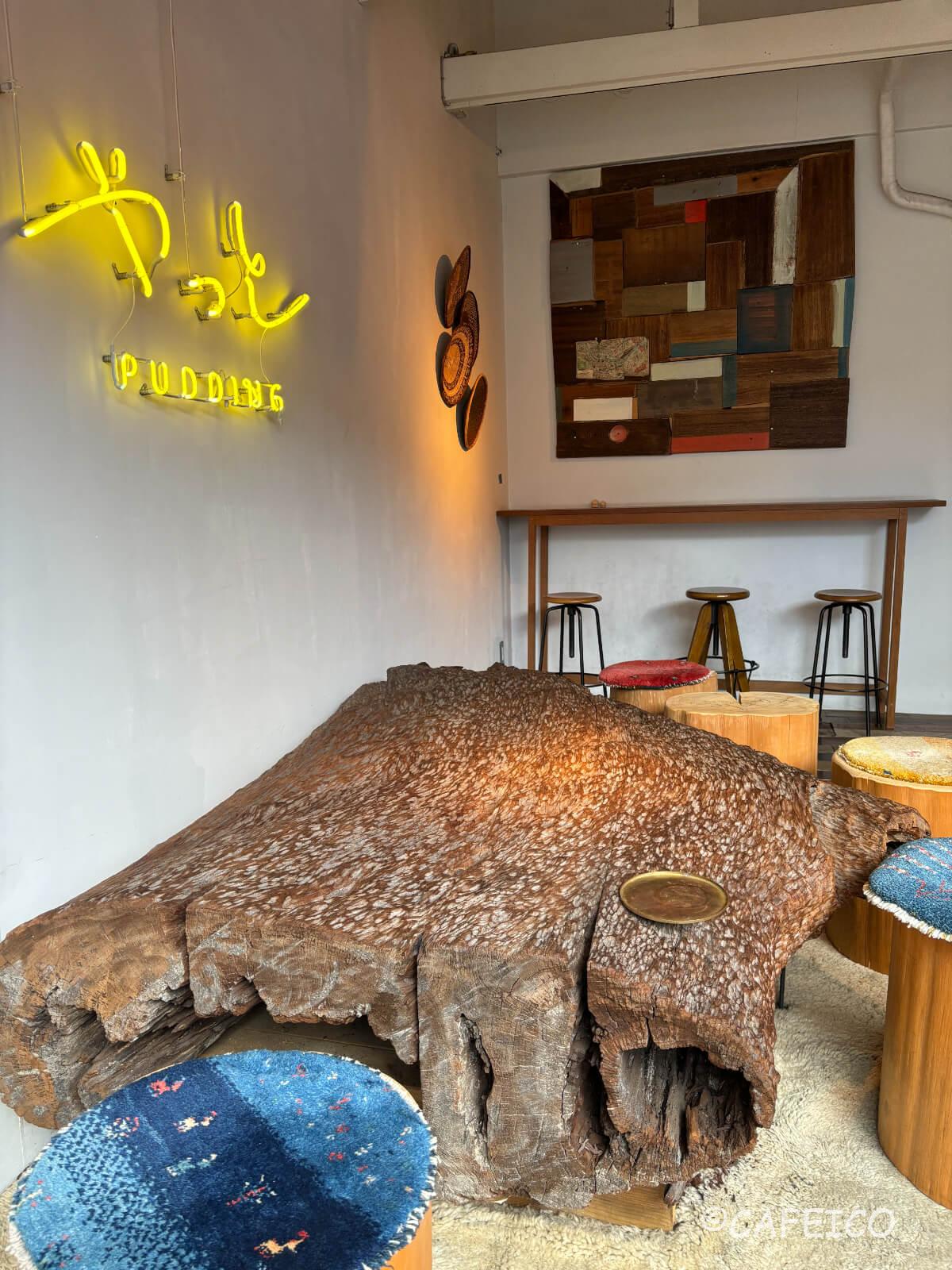 この大きな木製オブジェは座ってもOK。お皿を置く場所があって、ここにプリンを置くと、、